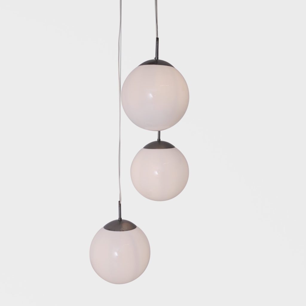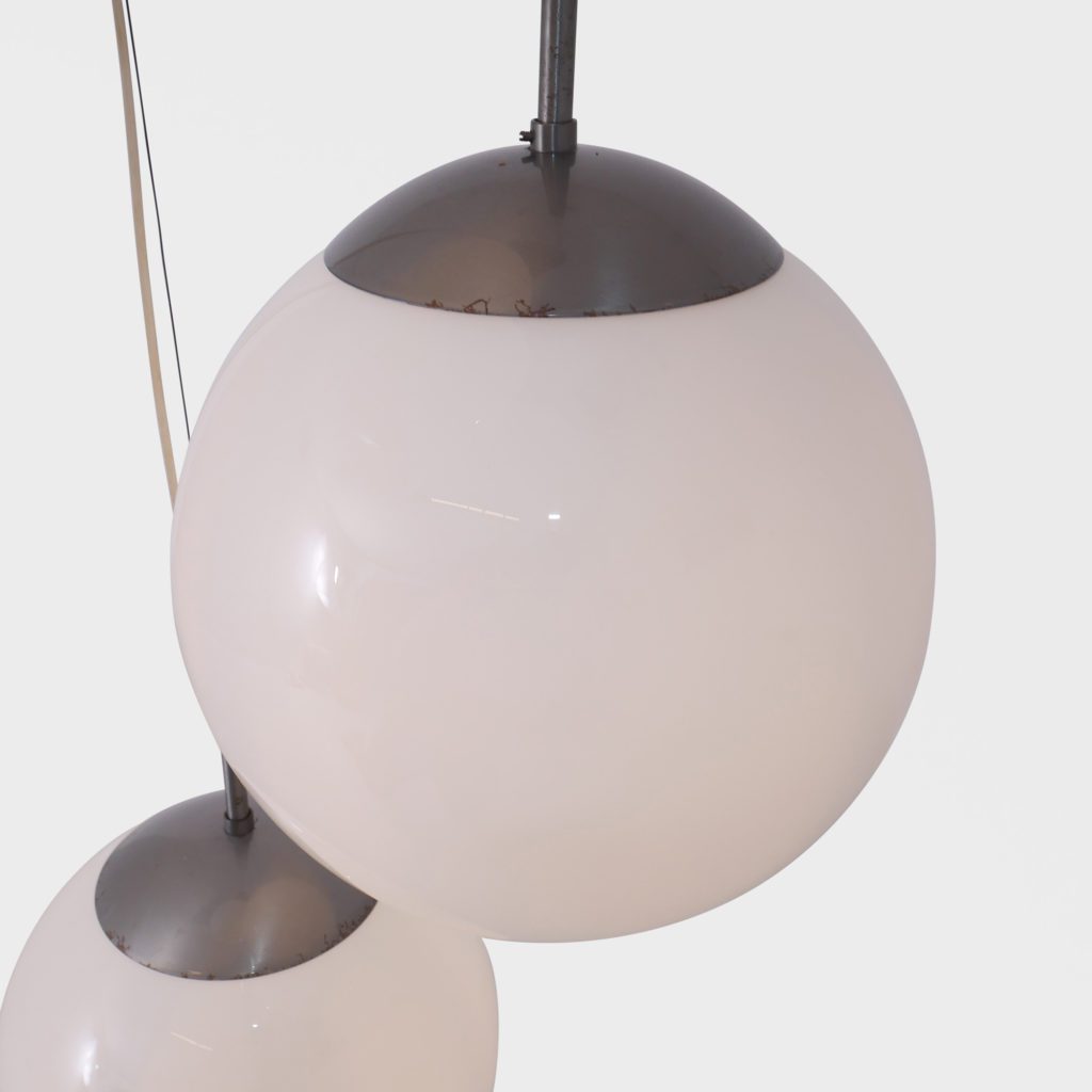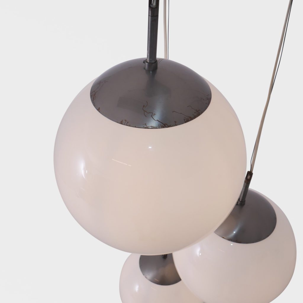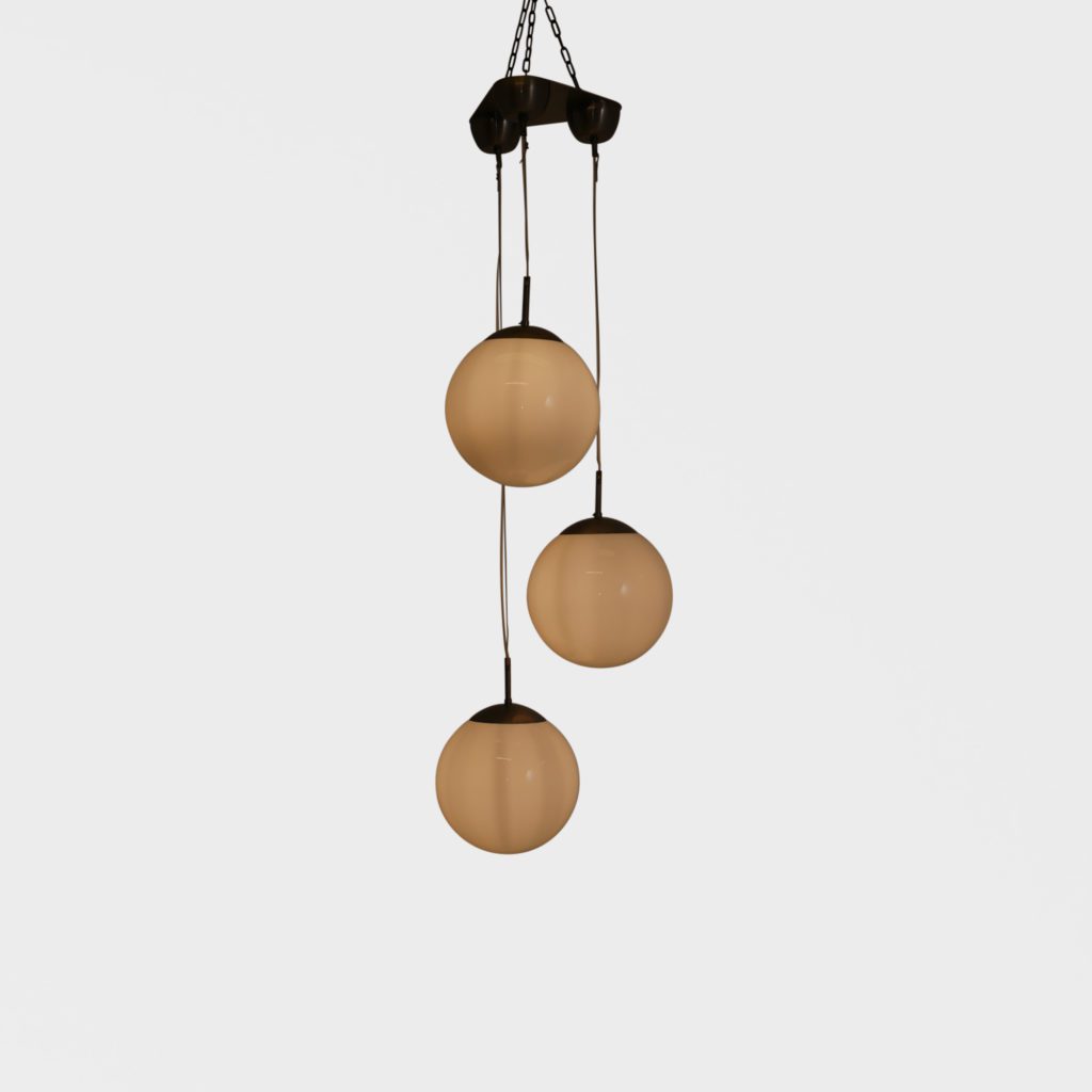 Stor taklampe med 3 lyskilder. Store kuler i opalinglass. Har tidligere hengt i en skole og er satt sammen av gamle lamper til å danne en lysekrone. Kan justere høyden. Hver kuppel er 31 cm i diamter Tilstand: God vintage stand Mål: Ø kule: 31cm L fra nederste kule lengst ned på kula: 185cm max NB: lengde kan reguleres på alle kuler