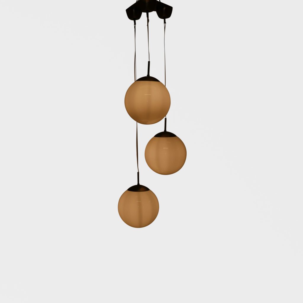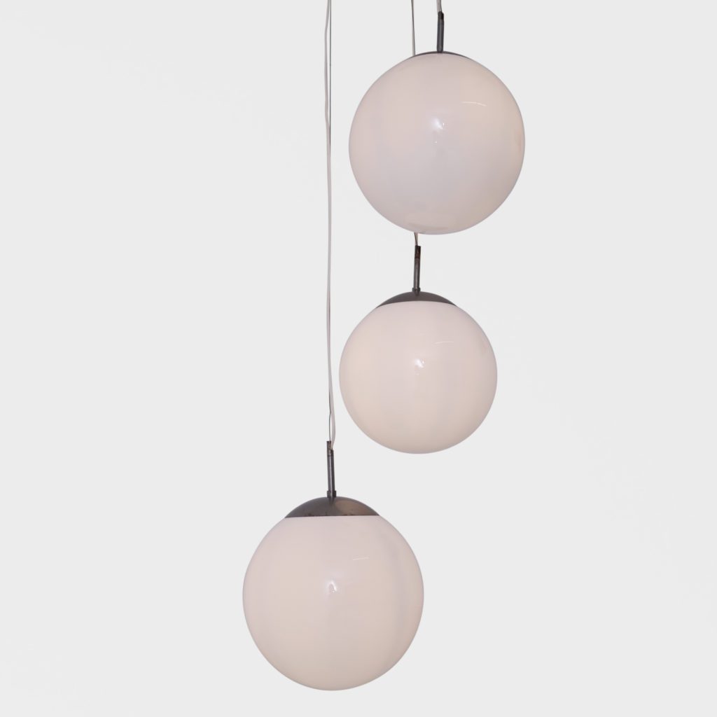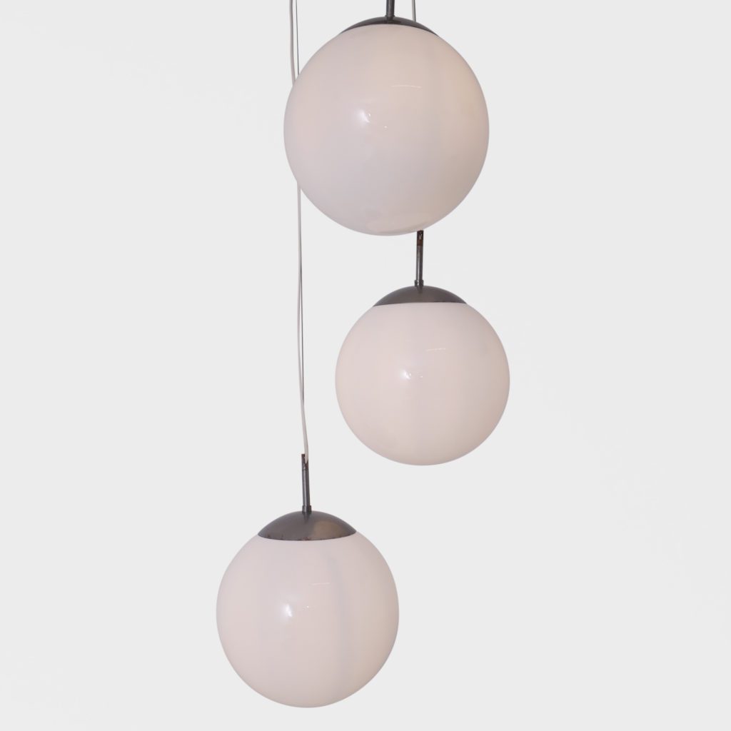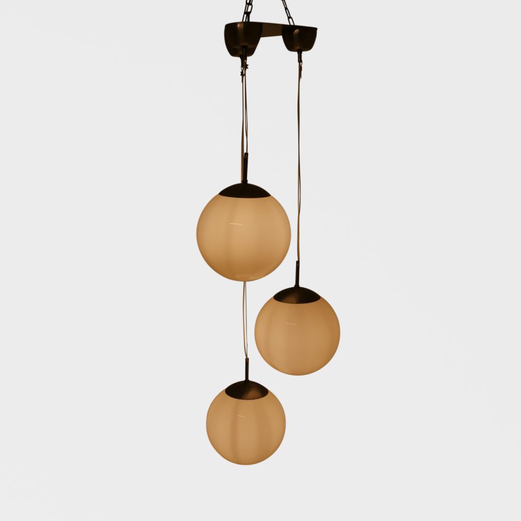 Stor taklampe med 3 lyskilder. Store kuler i opalinglass. Har tidligere hengt i en skole og er satt sammen av gamle lamper til å danne en lysekrone. Kan justere høyden. Hver kuppel er 31 cm i diamter Tilstand: God vintage stand Mål: Ø kule: 31cm L fra nederste kule lengst ned på kula: 185cm max NB: lengde kan reguleres på alle kuler