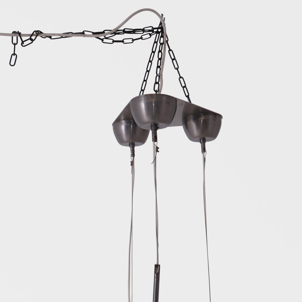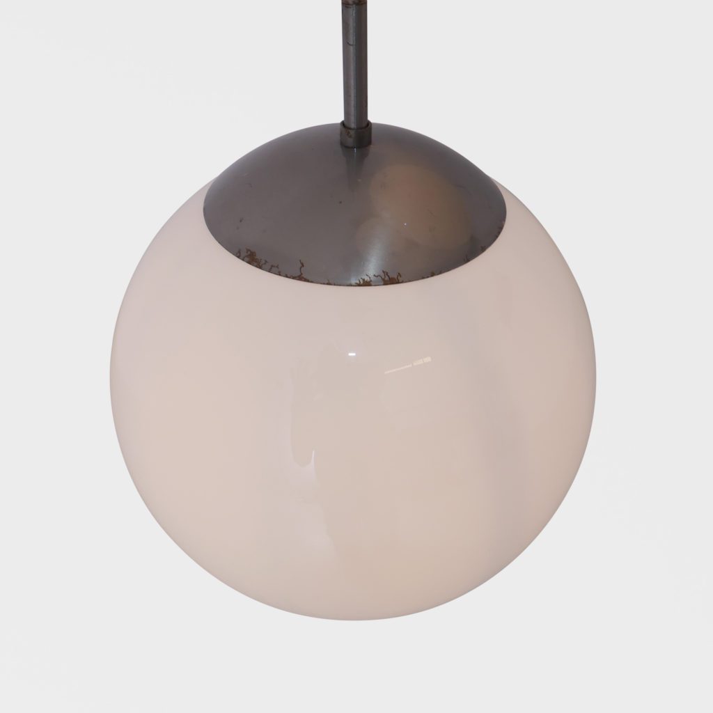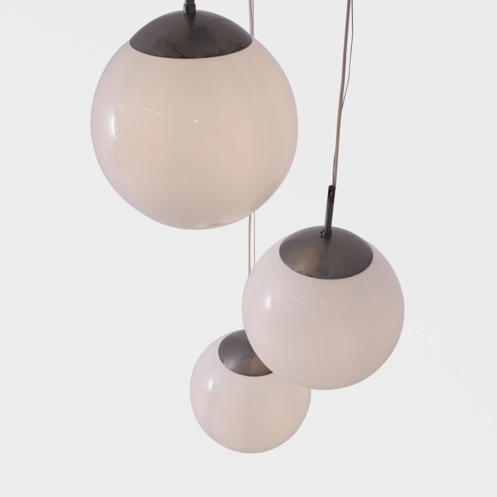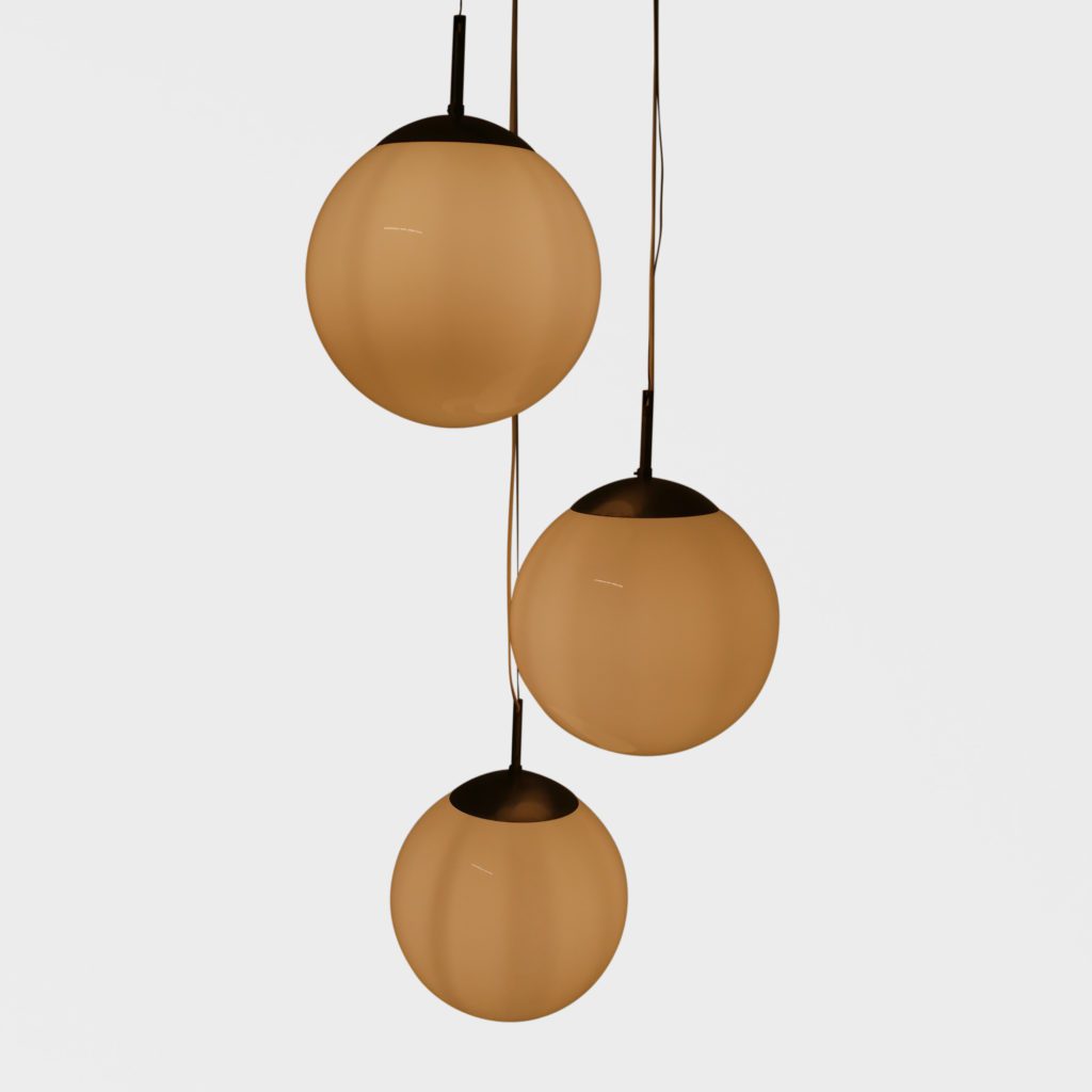 Stor taklampe med 3 lyskilder. Store kuler i opalinglass. Har tidligere hengt i en skole og er satt sammen av gamle lamper til å danne en lysekrone. Kan justere høyden. Hver kuppel er 31 cm i diamter Tilstand: God vintage stand Mål: Ø kule: 31cm L fra nederste kule lengst ned på kula: 185cm max NB: lengde kan reguleres på alle kuler
