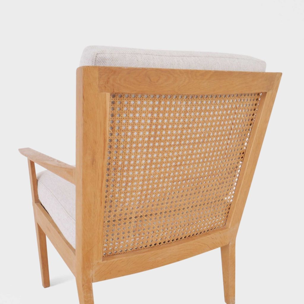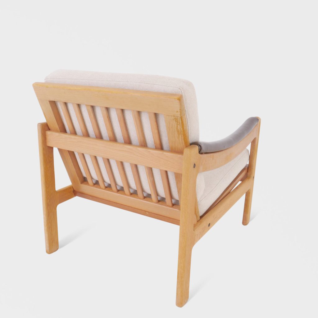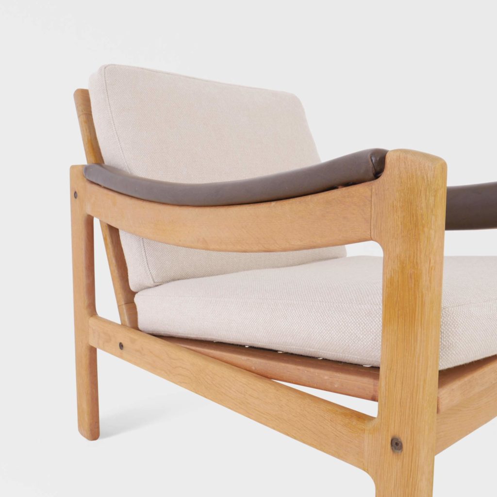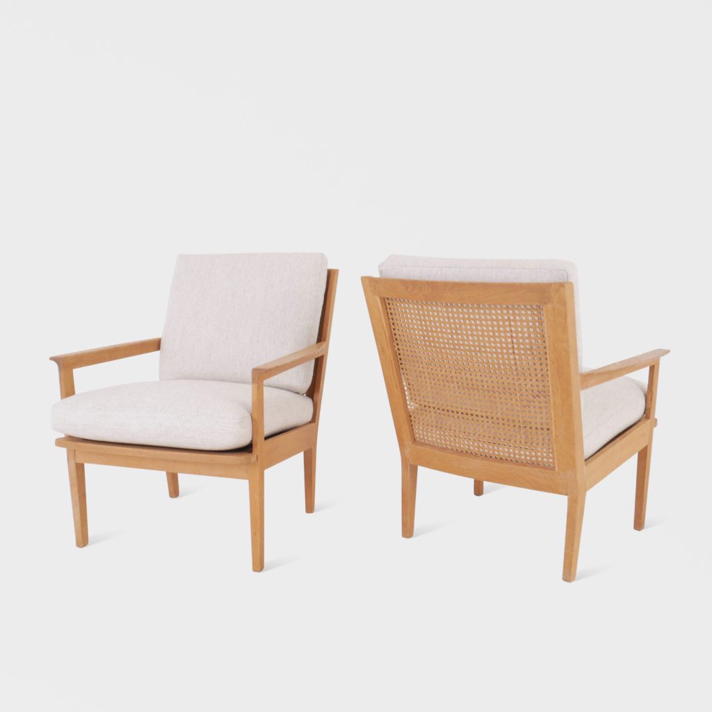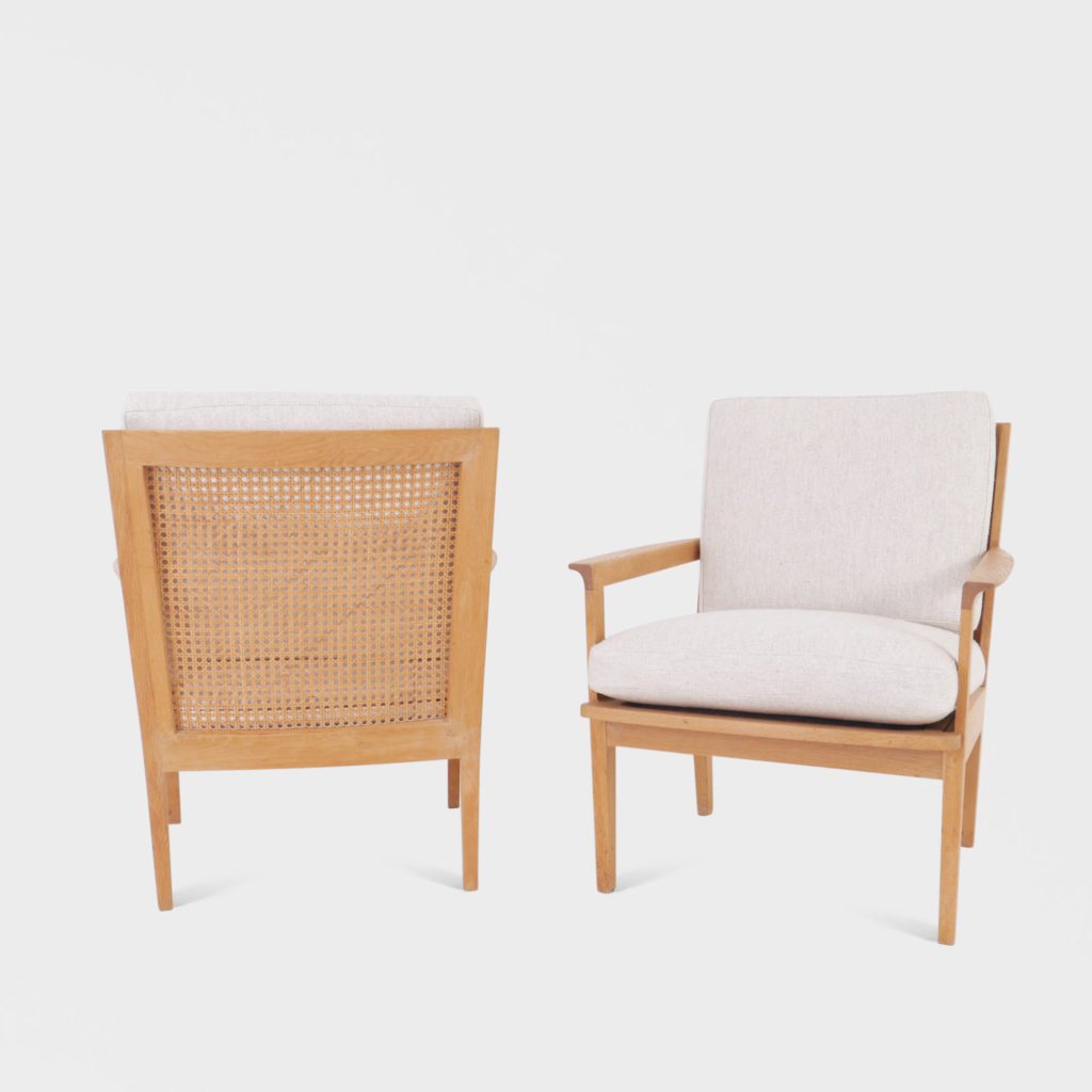Elegant lenestol utført i eik og med rotting i ryggen. Ukjent designer og produsent. Nyomtrukket av vår møbeltapetserer i ullstoffet Hallingdal 220 fra Gudbrandsdalen Uldvarefabrik. Klassisk skandinavisk stil av høy kvalitet med behagelige finish. Pris per stol Designer: Ukjent Produsent: Ukjent Land: Norge År: 1960-tallet Tilstand: God vintage stand Mål: H: 80cm H.sitte: 42cm B: 65cm D: 81cm Frakt: - Pris inkluderer frakt på strekningen Drammen - Oslo onsdager mellom 15-20 (til gateplan). - Vi sender i hele landet. Ta kontakt for gode priser på frakt. - Lageret er alltid åpent for besøk Tirsdag & Onsdag kl 14-17. Ring 926 22 989 ved ankomst. Disclaimer: Vintage møbler er et produkt av høy kvalitet som varer flere liv av en grunn. Noen har en rik historie, hvor enkelte produkter vil bære preg av dette. Studer derfor bildene godt før kjøp.