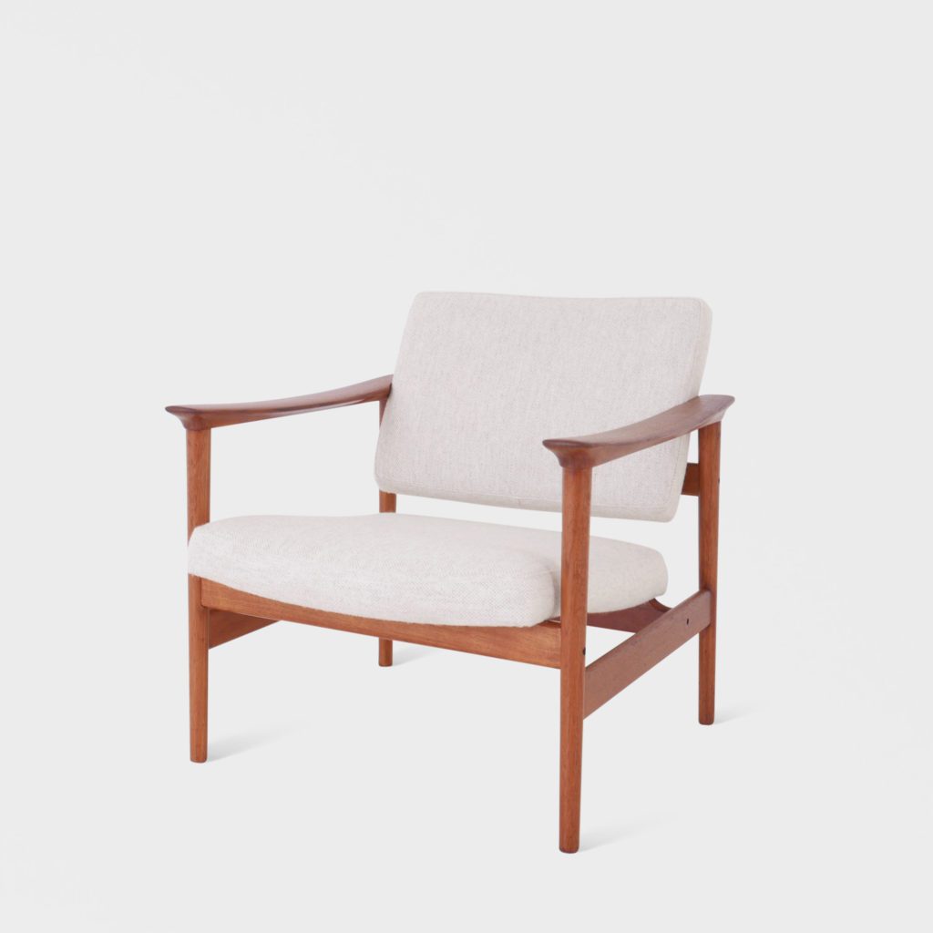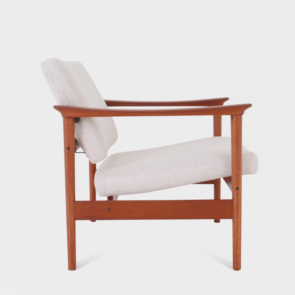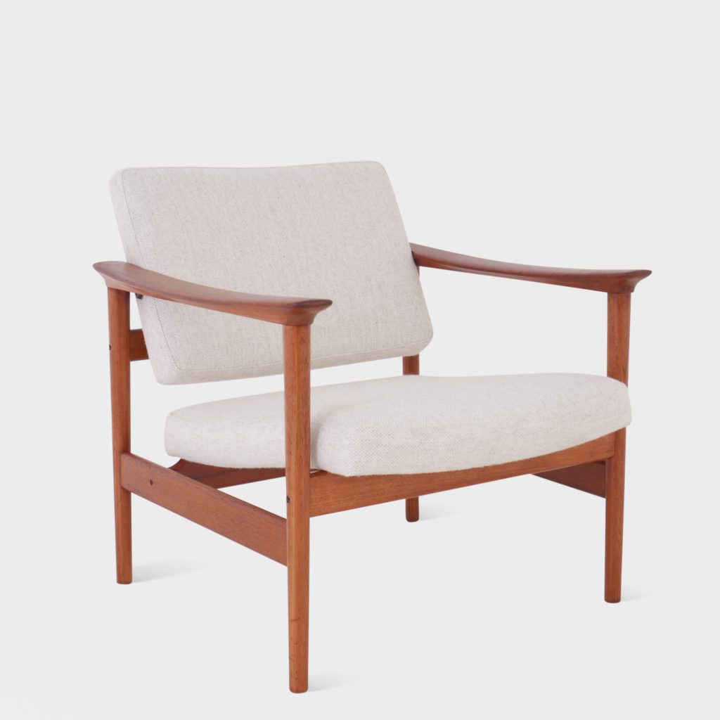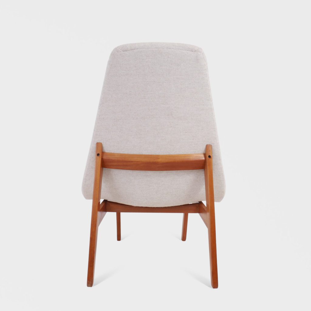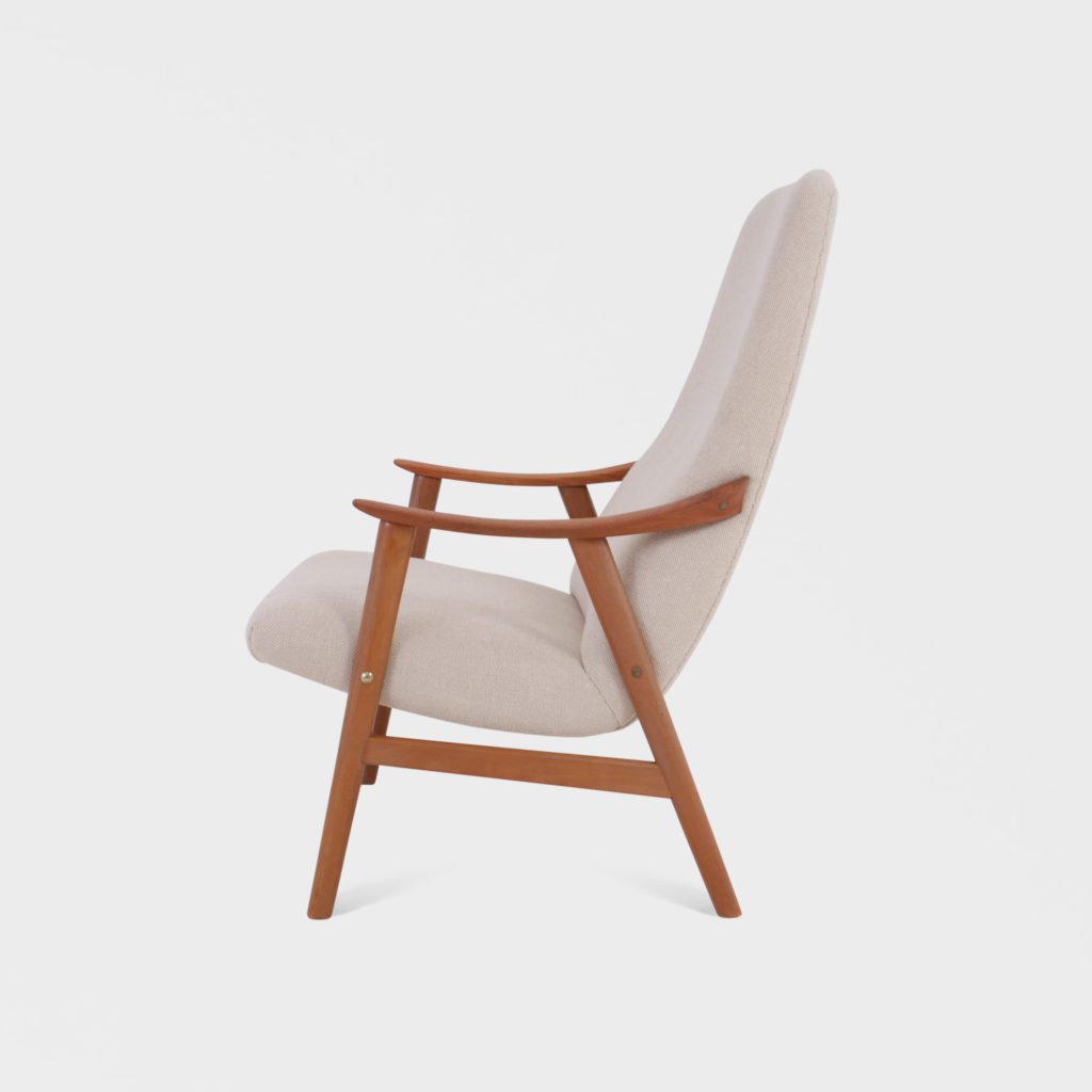 Elegant lenestol med ukjent desginer og produsent. Nyomtrukket av vår møbeltapetserer i ullstoffet Hallingdal 220 fra Gudbrandsdalen Uldvarefabrik. Klassisk skandinavisk stil av høy kvalitet med behagelige finish. Designer: Ukjent Produsent: Ukjent Land: Norge År: 1960-tallet Tilstand: God vintage stand Mål: H:71cm H.sete:36cm B:66cm D:81cm Frakt: - Pris inkluderer frakt på strekningen Drammen - Oslo onsdager mellom 15-20 (til gateplan). - Vi sender i hele landet. Ta kontakt for gode priser på frakt. - Lageret er alltid åpent for besøk Tirsdag & Onsdag kl 14-17. Ring 926 22 989 ved ankomst. Disclaimer: Vintage møbler er et produkt av høy kvalitet som varer flere liv av en grunn. Noen har en rik historie, hvor enkelte produkter vil bære preg av dette. Studer derfor bildene godt før kjøp.