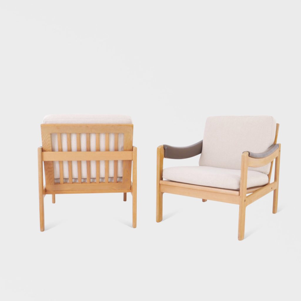 Unike lenestoler med særegne innfatning fra Hiorth & Østlyngen. Nyomtrukket med saueskinn i høy kvalitet fra New Zealand i fargen natur av vår møbeltapetserer. Stolene er i god vintage stand. Prisen er per stol Produsent: Hiorth & Østlyngen Land: Norge År: 1950-tallet Tilstand: God vintage stand Mål: H: 81cm H.sitte: 41cm B: 65cm D: 67cm Frakt: - Pris inkluderer frakt på strekningen Drammen - Oslo onsdager mellom 15-20 (til gateplan). - Vi sender i hele landet. Ta kontakt for gode priser på frakt. - Lageret er alltid åpent for besøk Tirsdag & Onsdag kl 14-17. Ring 926 22 989 ved ankomst. Disclaimer: Vintage møbler er et produkt av høy kvalitet som varer flere liv av en grunn. Noen har en rik historie, hvor enkelte produkter vil bære preg av dette. Studer derfor bildene godt før kjøp.