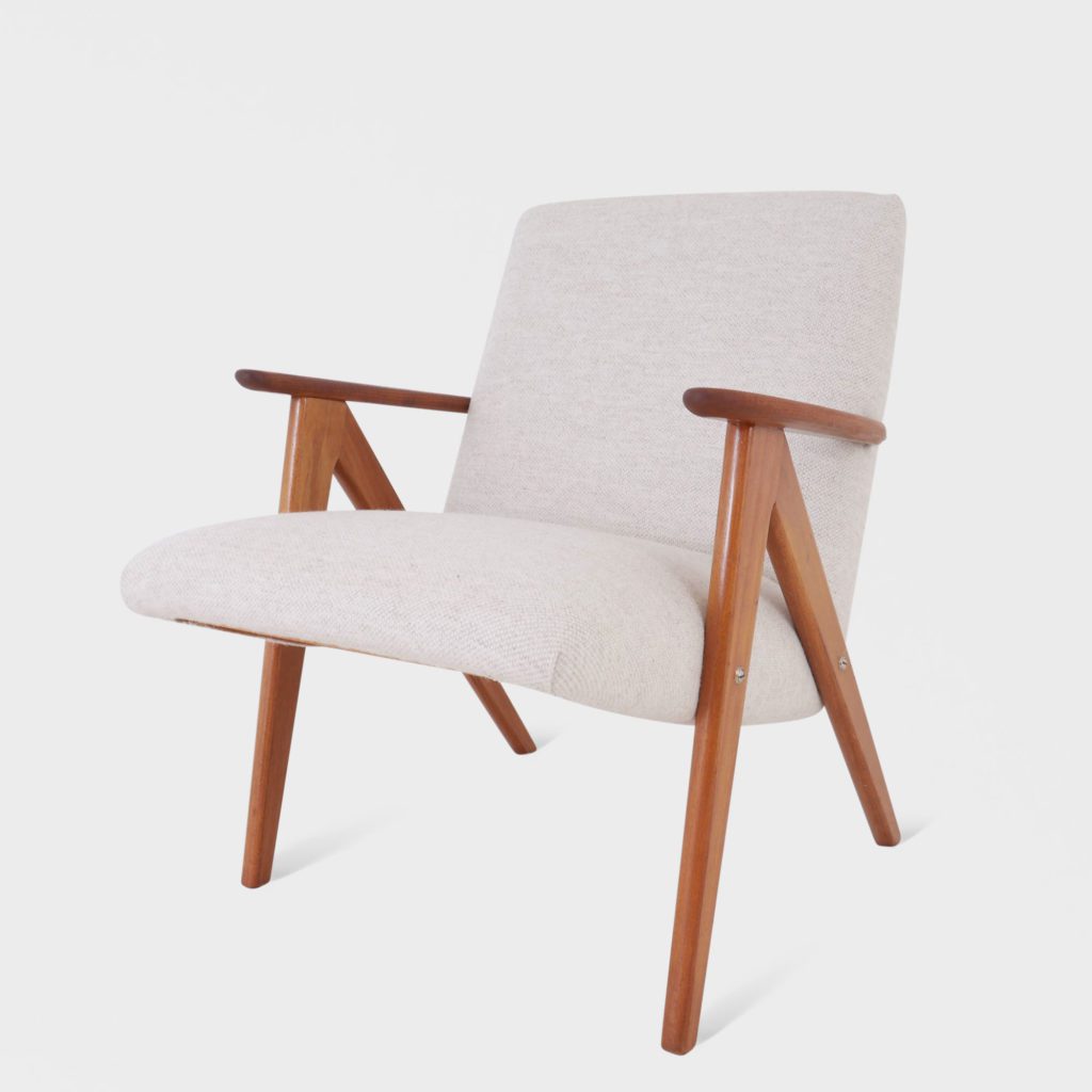 Elegant lenestol med ukjent designer og produsent. Nyomtrukket av vår møbeltapetserer i ullstoffet Amdal 122 fra Gudbrandsdalen Uldvarefabrik. Klassisk skandinavisk stil av høy kvalitet med behagelige finish. Designer: Ukjent Produsent: Ukjent Land: Norge År: 1960-tallet Tilstand: God vintage stand Mål: H:95cm H.sete:37cm B:65cm D:70cm Frakt: - Pris inkluderer frakt på strekningen Drammen - Oslo onsdager mellom 15-20 (til gateplan). - Vi sender i hele landet. Ta kontakt for gode priser på frakt. - Lageret er alltid åpent for besøk Tirsdag & Onsdag kl 14-17. Ring 926 22 989 ved ankomst. Disclaimer: Vintage møbler er et produkt av høy kvalitet som varer flere liv av en grunn. Noen har en rik historie, hvor enkelte produkter vil bære preg av dette. Studer derfor bildene godt før kjøp.