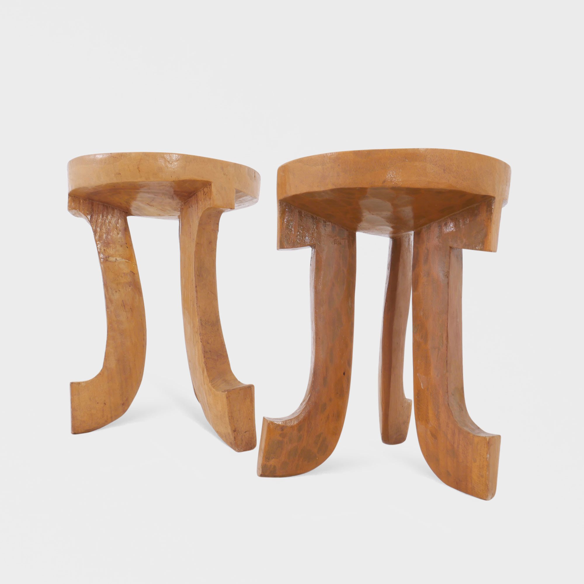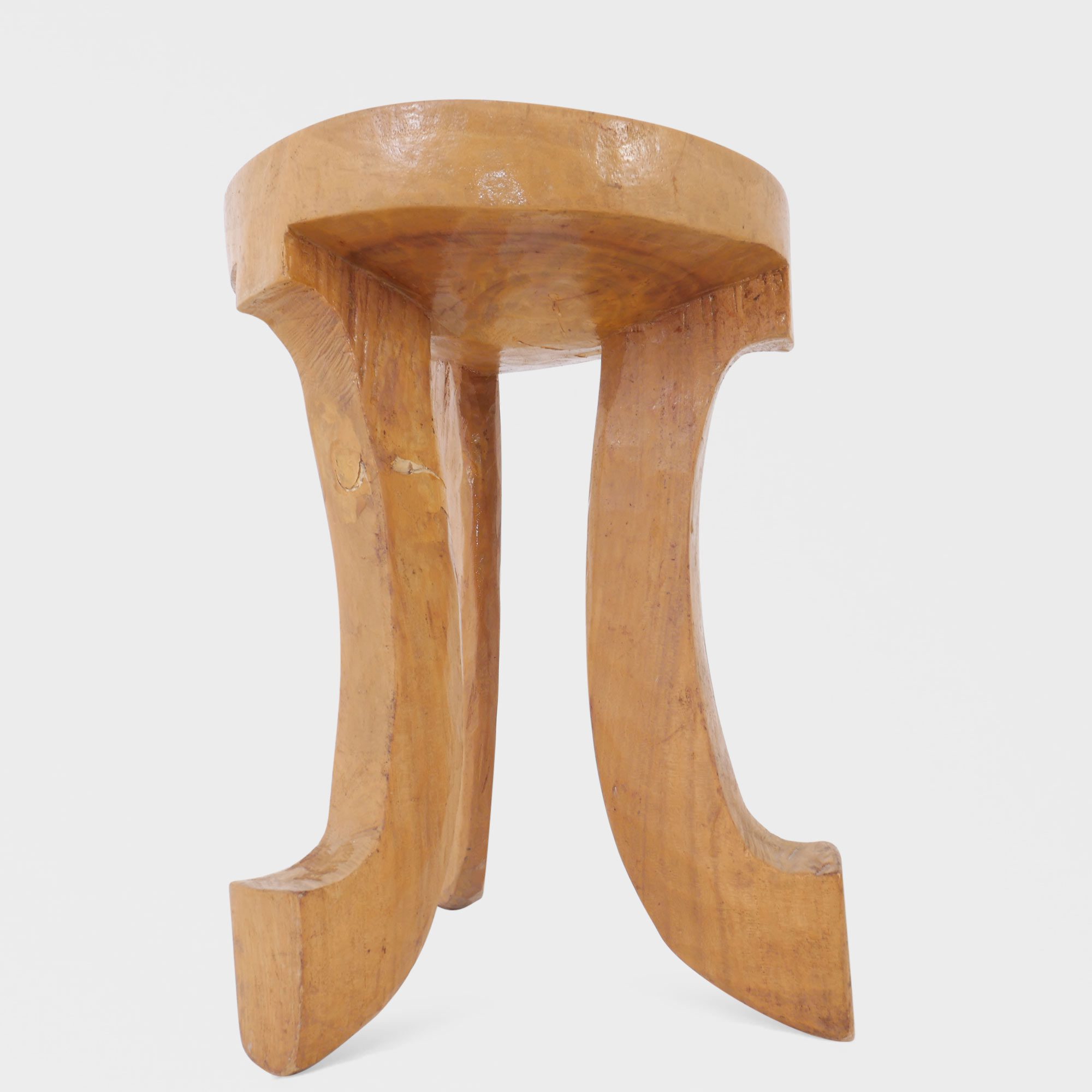 Håndskåret av hel trestamme, med karakteristiske svungne ben og organisk formet sete. Tradisjonell form fra Jimma- og Oromo-folkets stoler, her tolket i norsk utførelse.