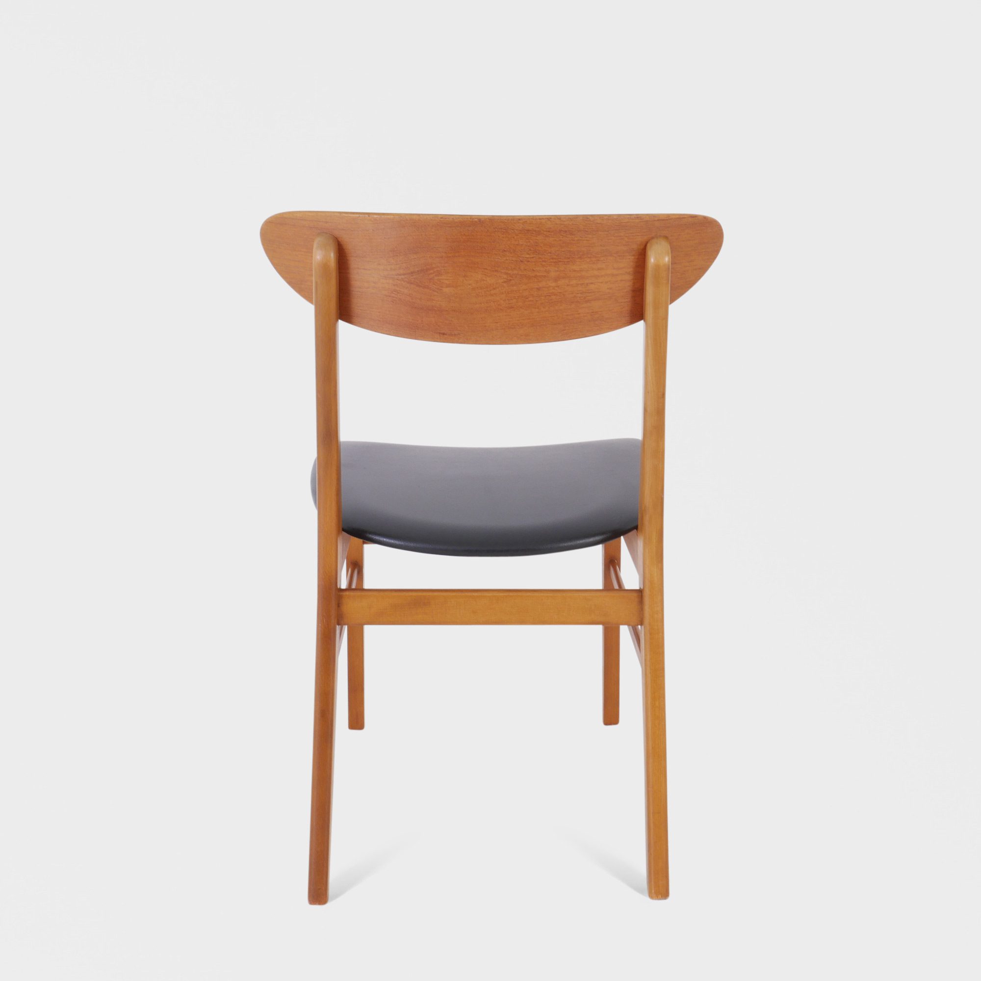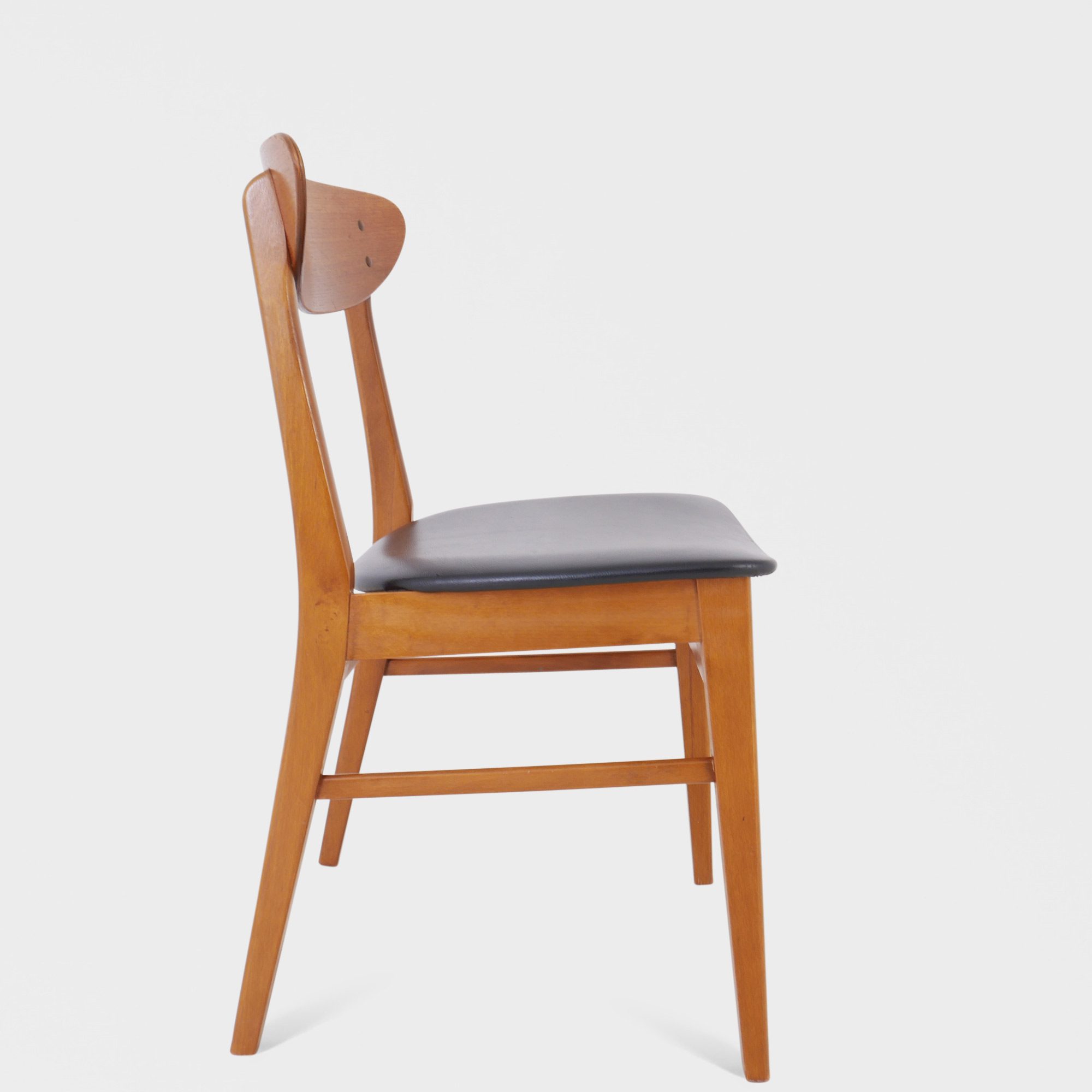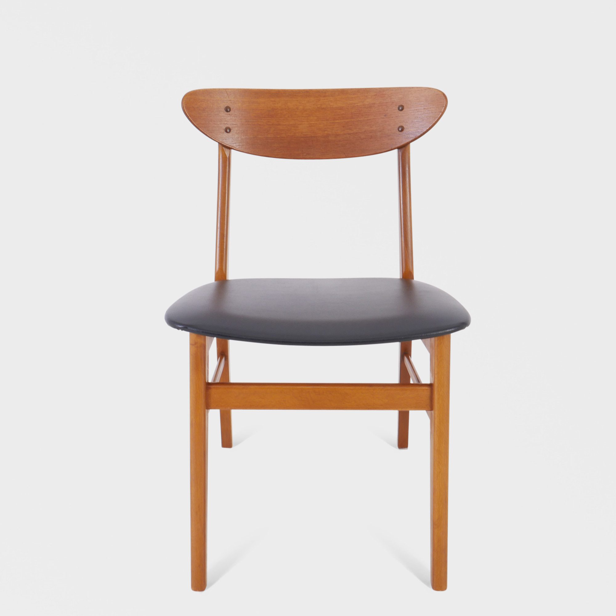4 stk vintage spisestuestoler med rygg i teak og et dansk design. Modell 210 fra Farstrup lisensprodusert av Stokke Fabrikker. Disse stolene har et karakteristisk funksjonelt design fra midten av forrige århundre, rammer i solid bøk, ryggstøtter i teak og seter i sort skai. Et populært design som passer rett inn i ditt moderne eller vintage interiør. Stolene er i god vintage stand.