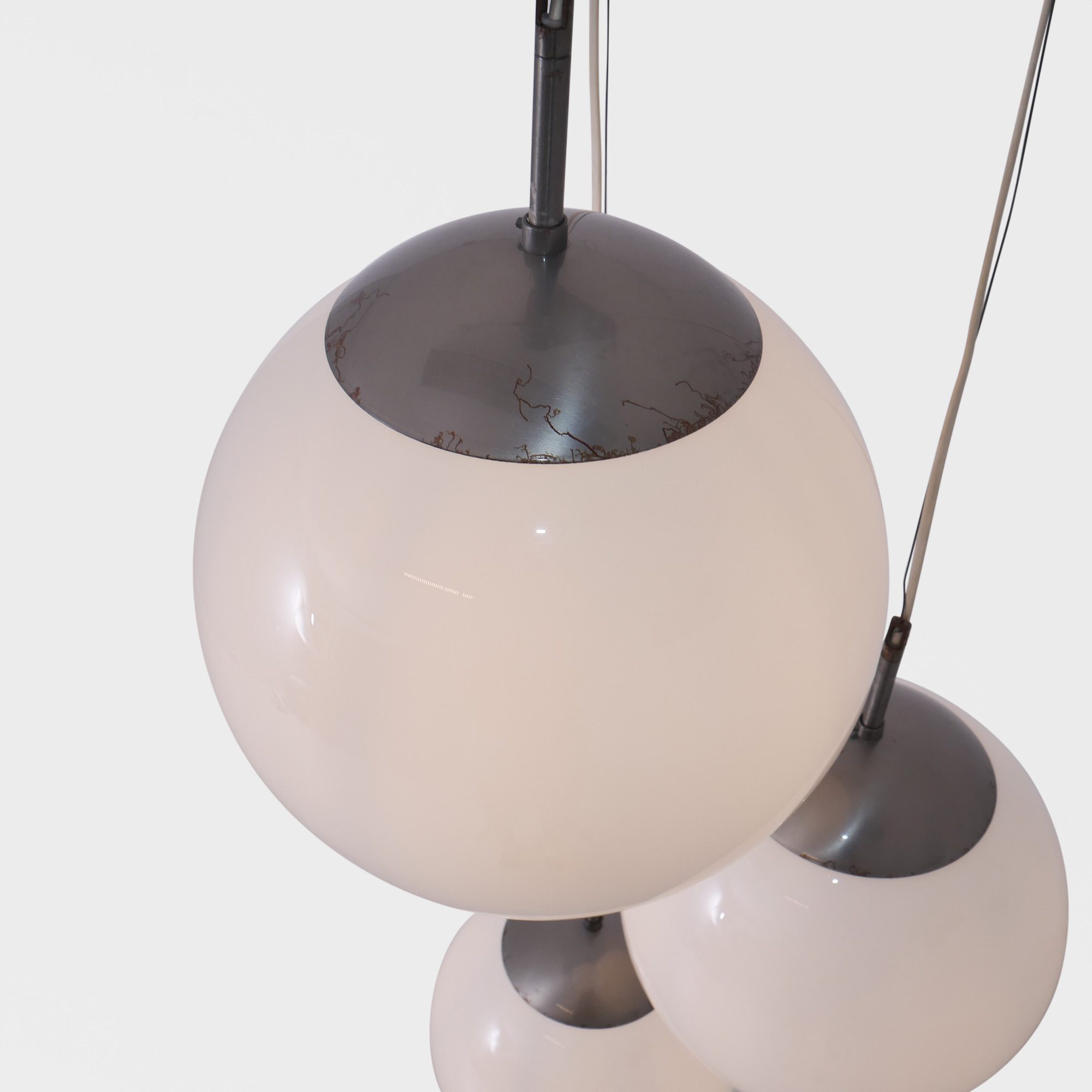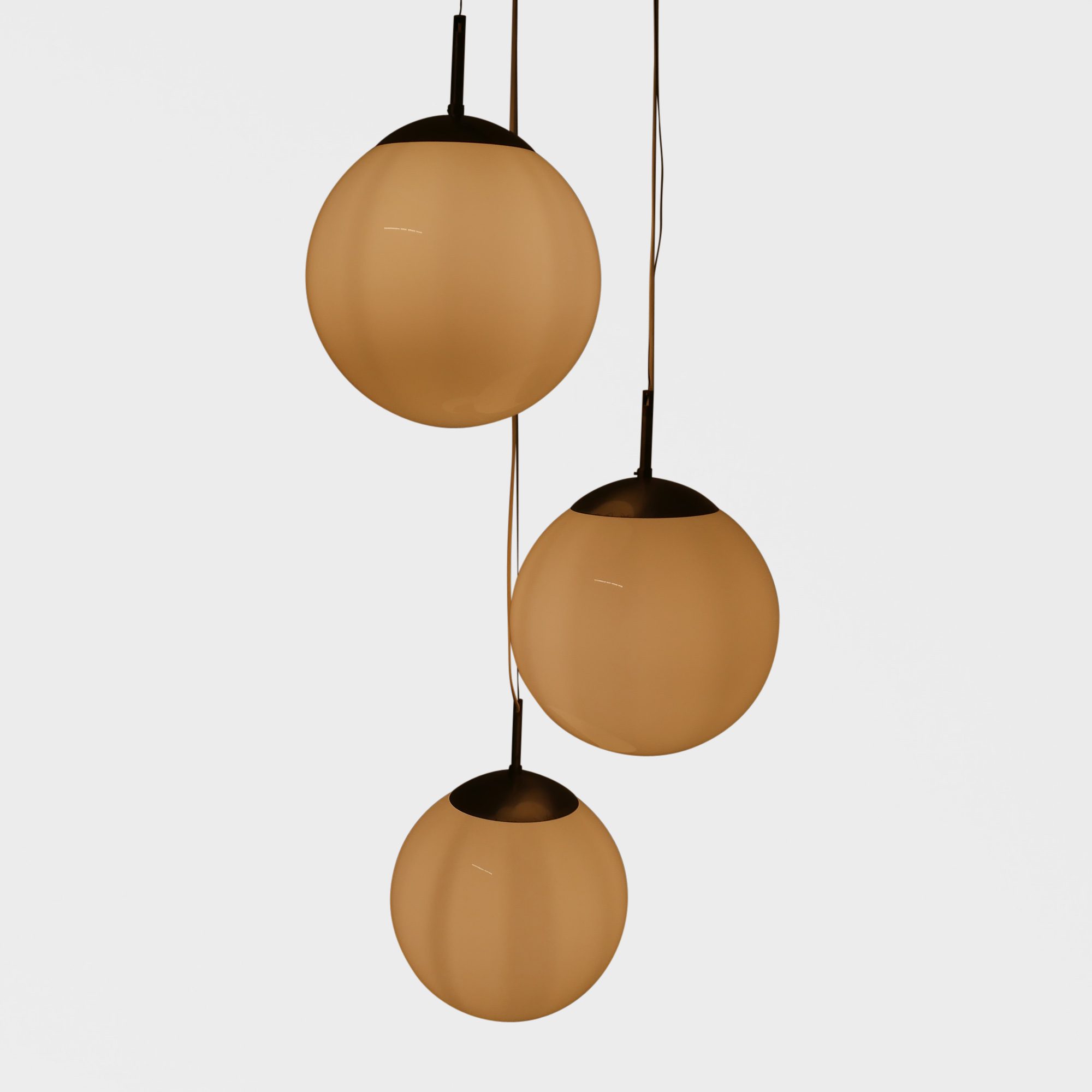 Stor taklampe med 3 lyskilder. Store kuler i opalinglass. Har tidligere hengt i en skole og er satt sammen av gamle lamper til å danne en lysekrone. Kan justere høyden. Hver kuppel er 31 cm i diamter