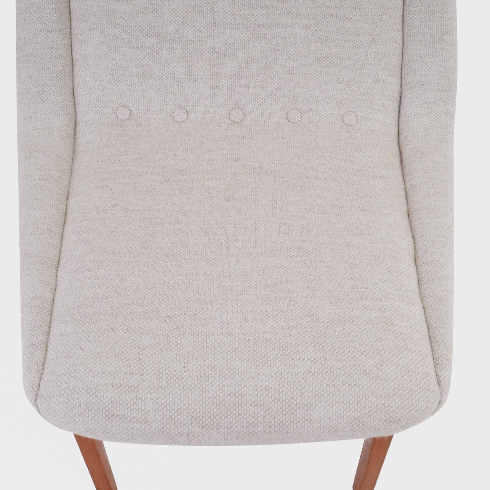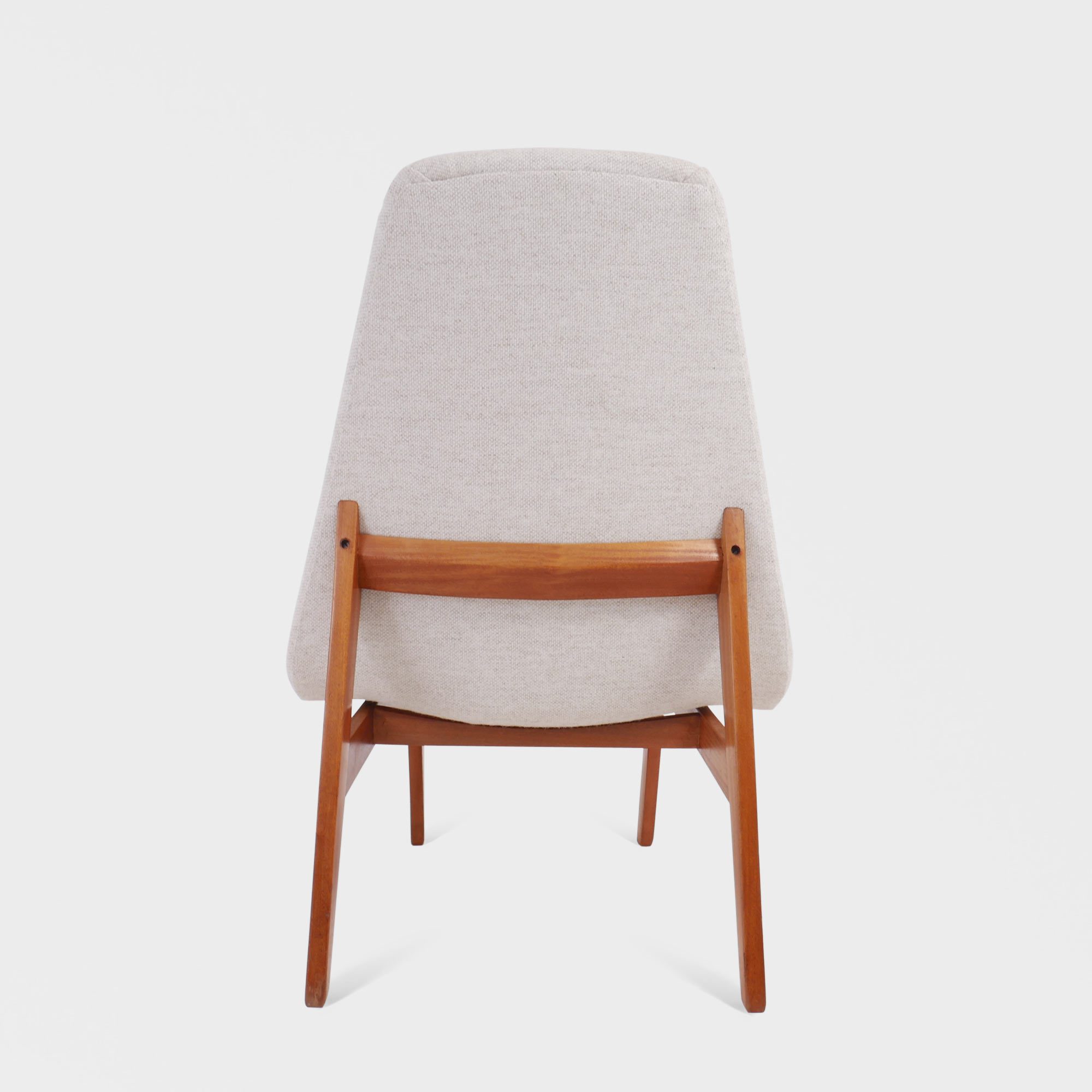 Elegant lenestol med ukjent designer og produsent. Nyomtrukket av vår møbeltapetserer i ullstoffet Amdal 122 fra Gudbrandsdalen Uldvarefabrik. Klassisk skandinavisk stil av høy kvalitet med behagelige finish.