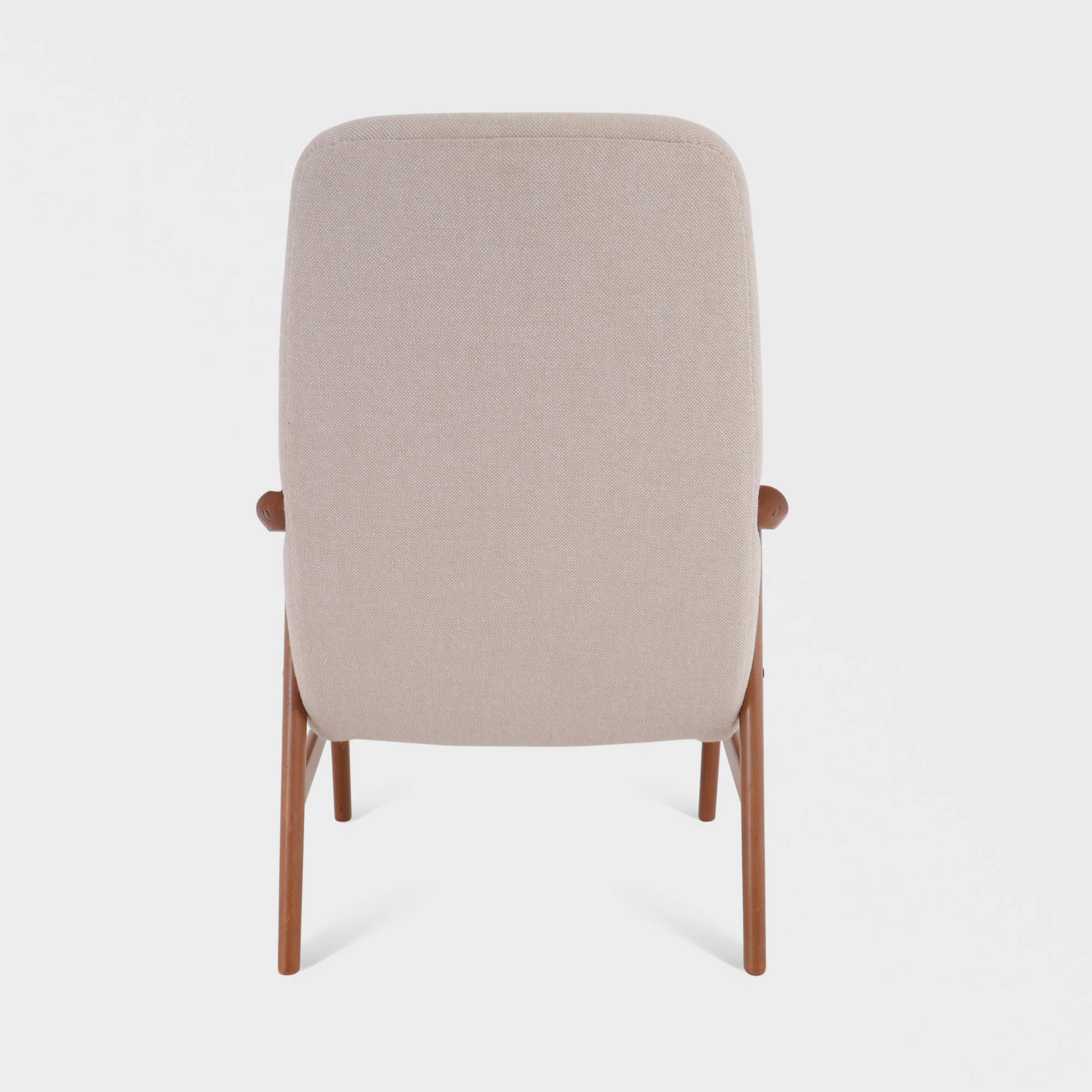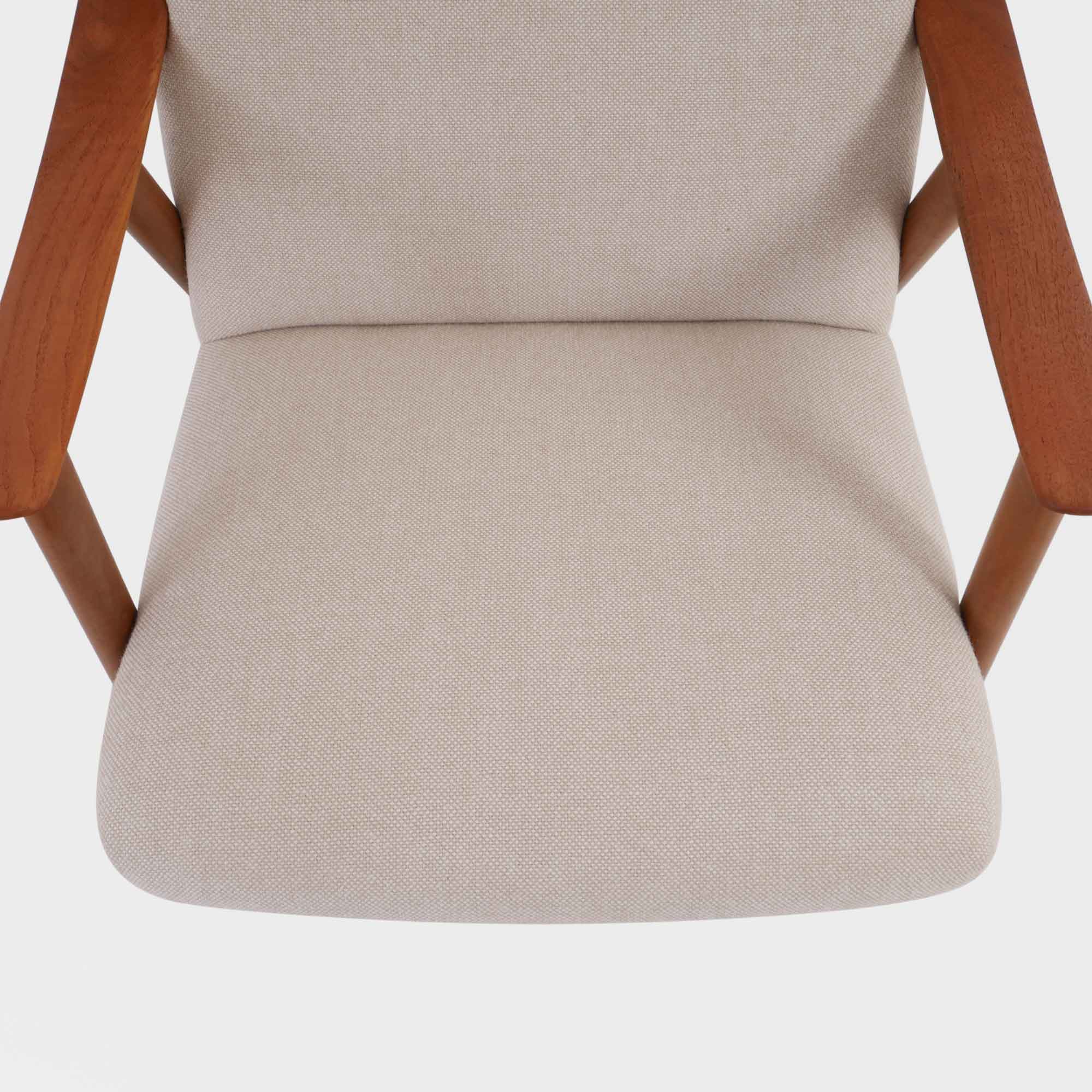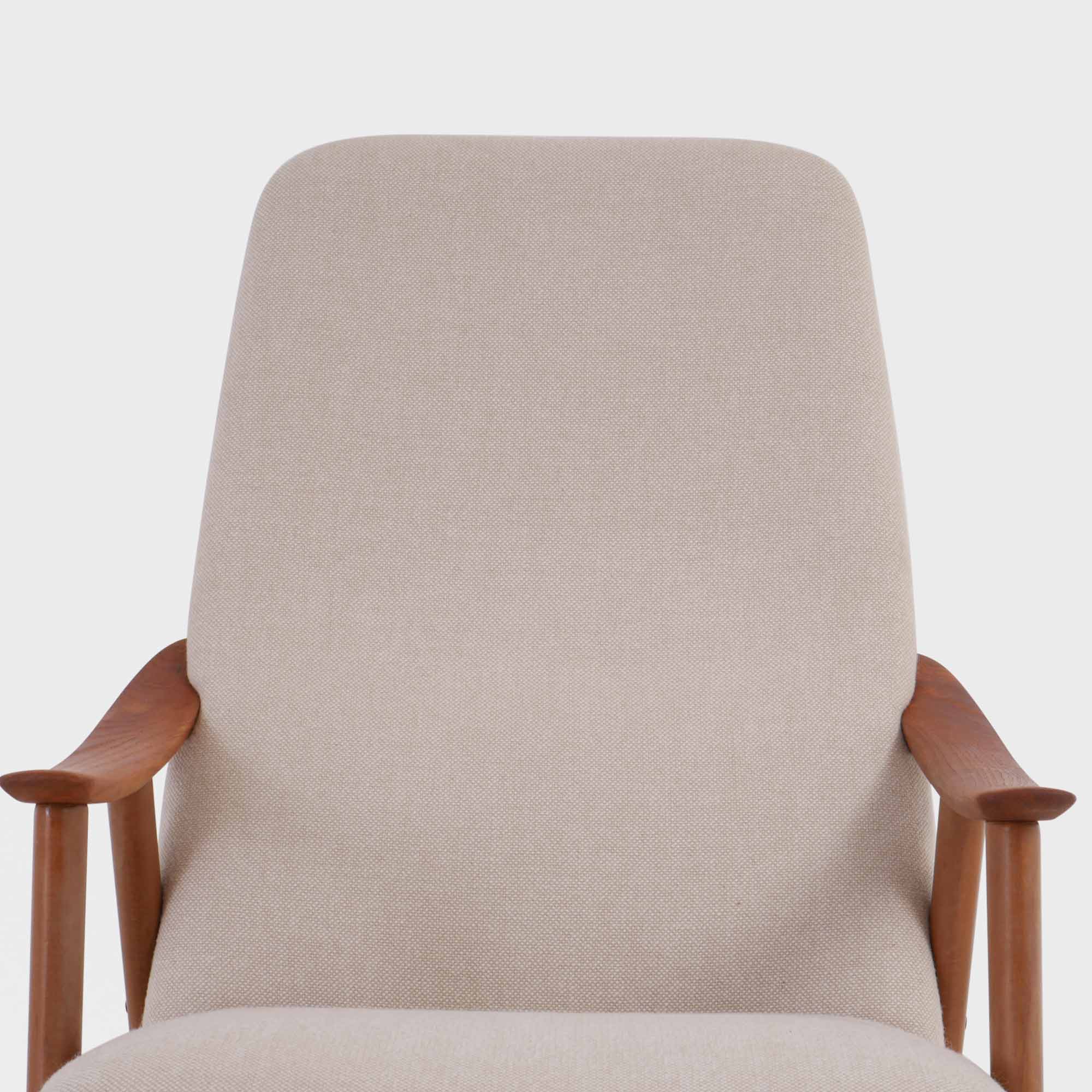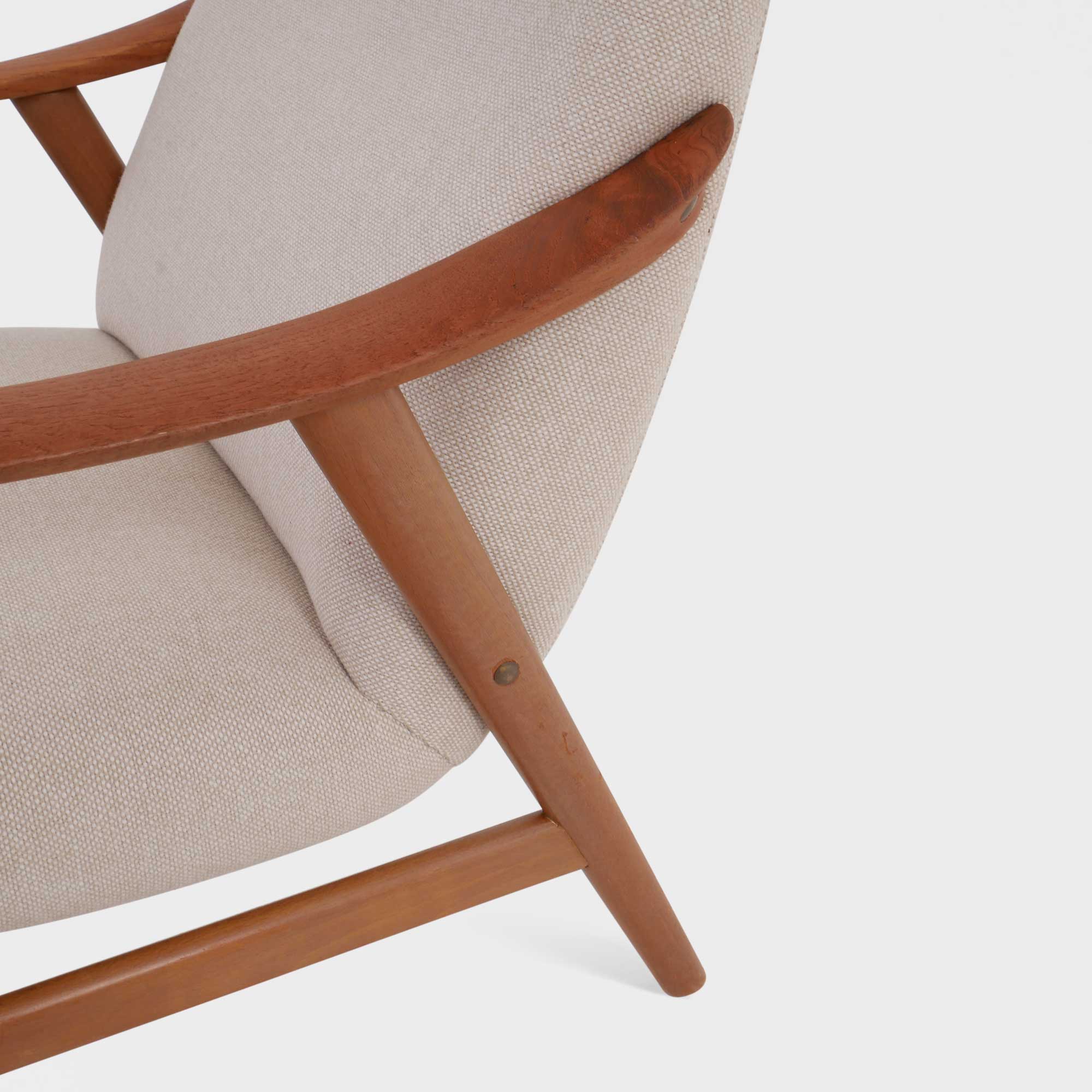 Elegant lenestol med ukjent designer og produsent. Nyomtrukket av vår møbeltapetserer i ullstoffet Hallingdal 200 fra Gudbrandsdalen Uldvarefabrik. Klassisk skandinavisk stil av høy kvalitet med behagelige finish.