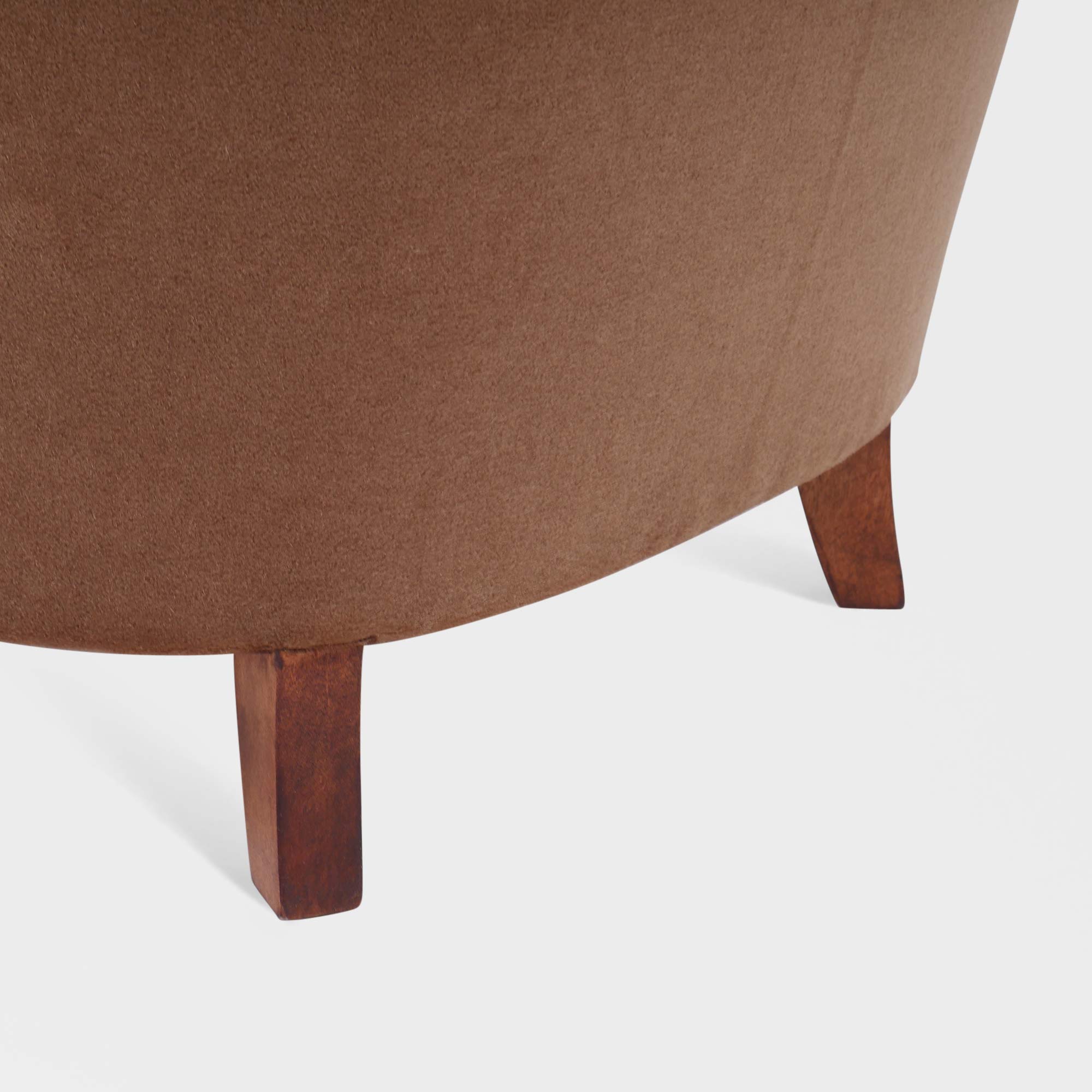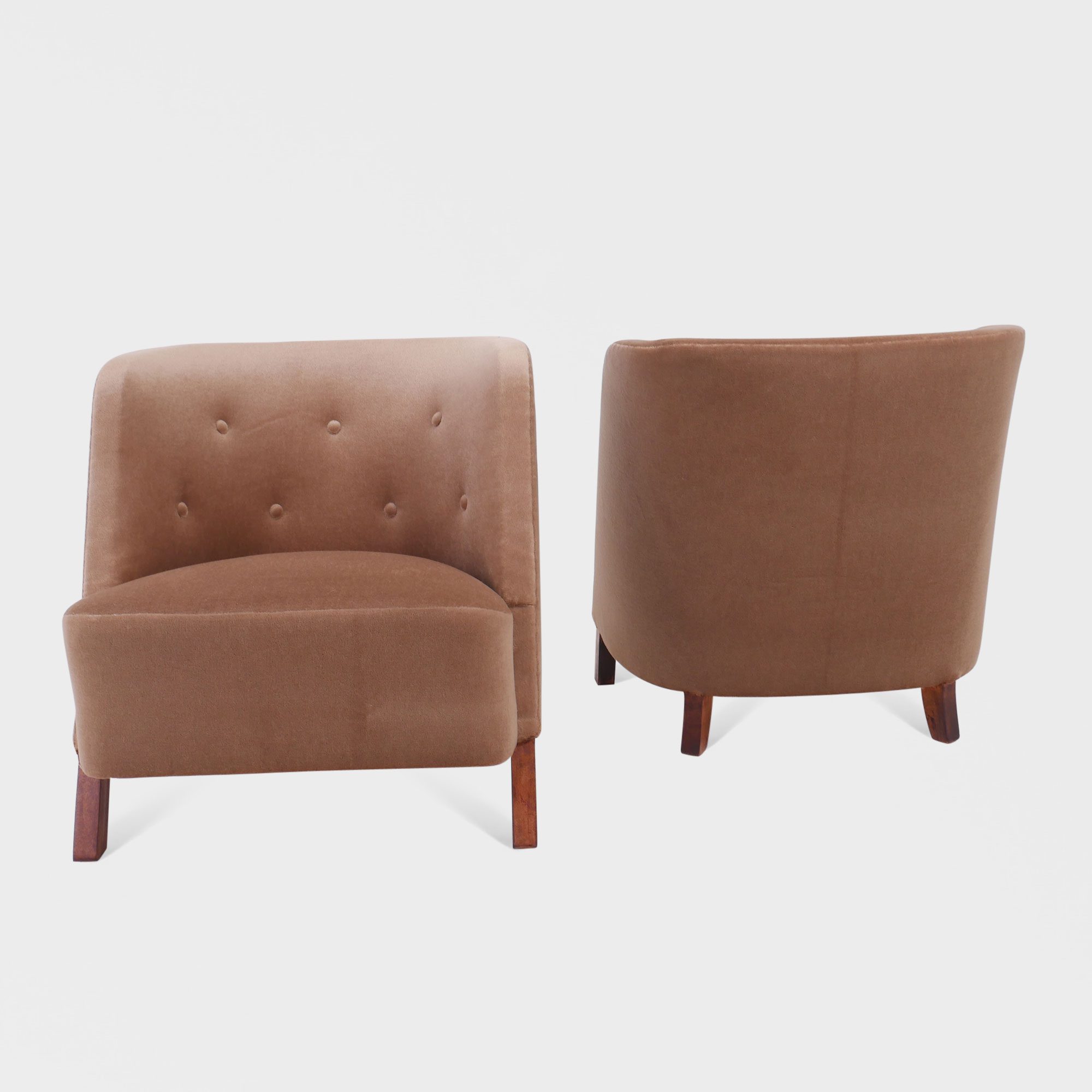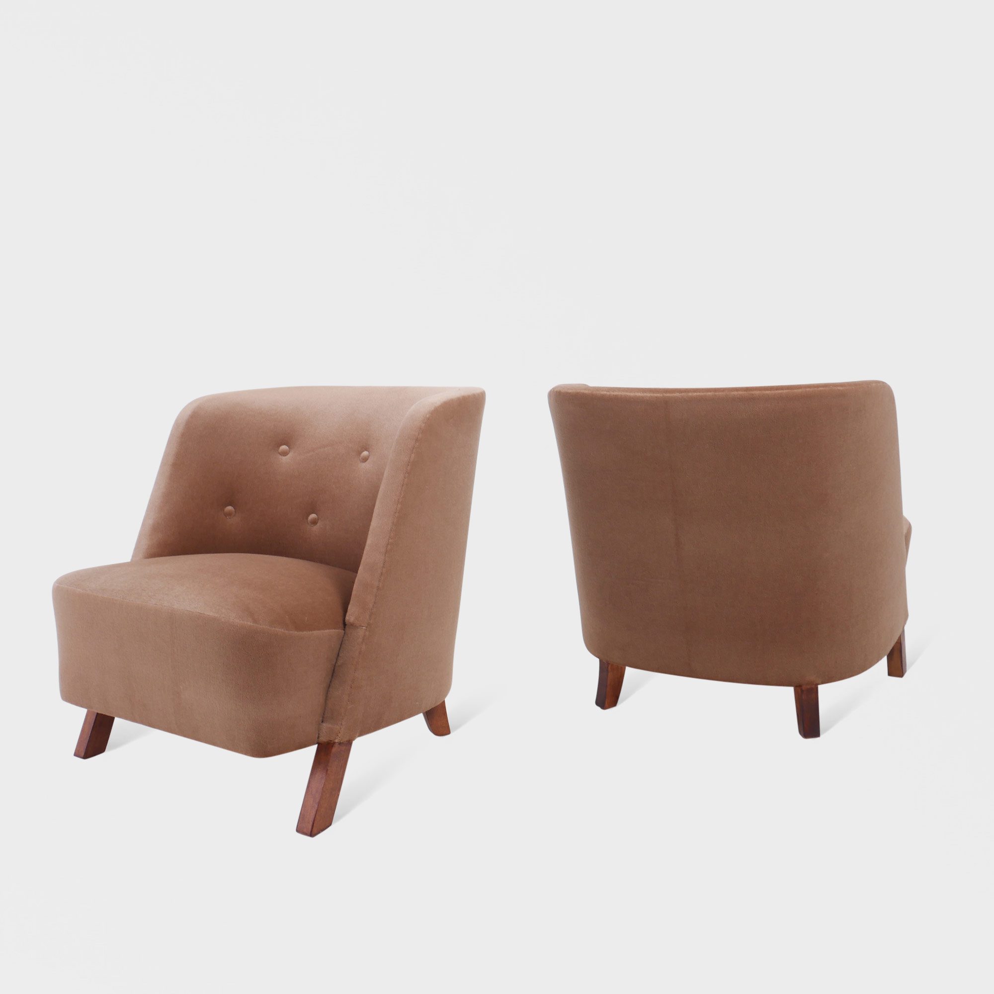 Unike retro lenestoler med flotte former nyomtrukket i nydelig velur av vår møbeltapetserer. Organisk i formene med gode proporsjoner. Ukjent designer.
