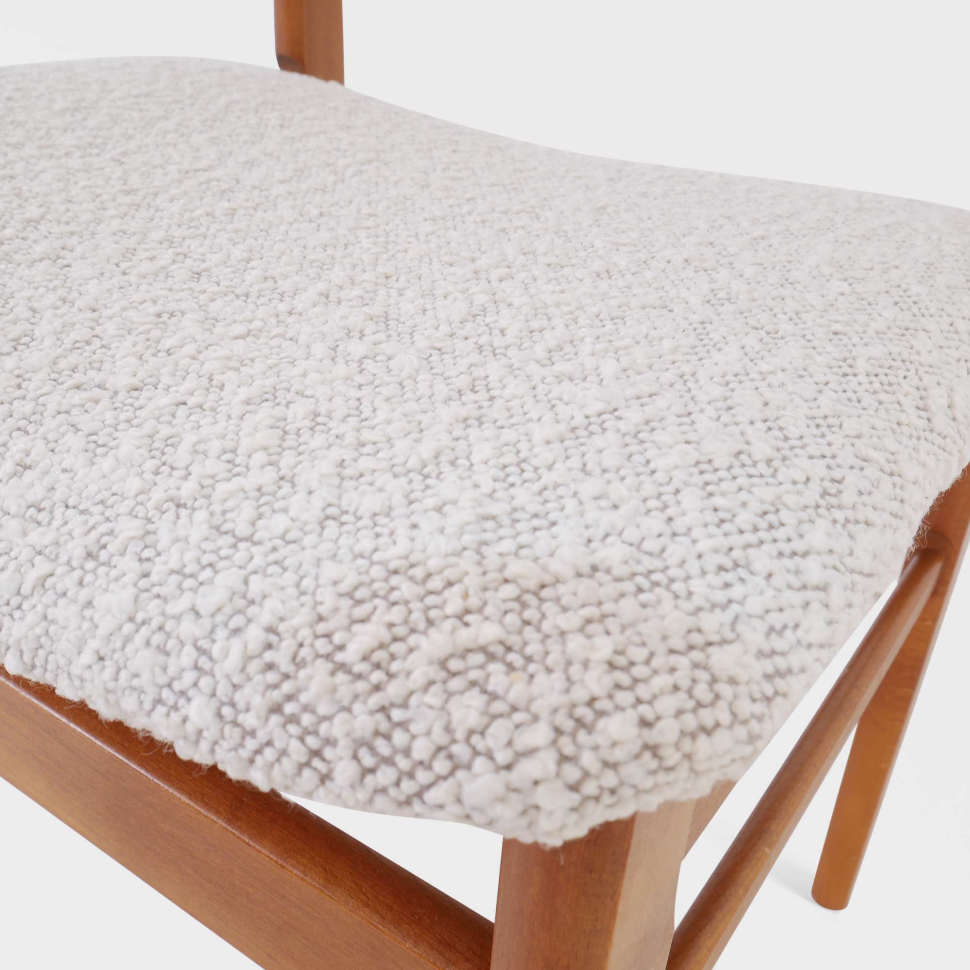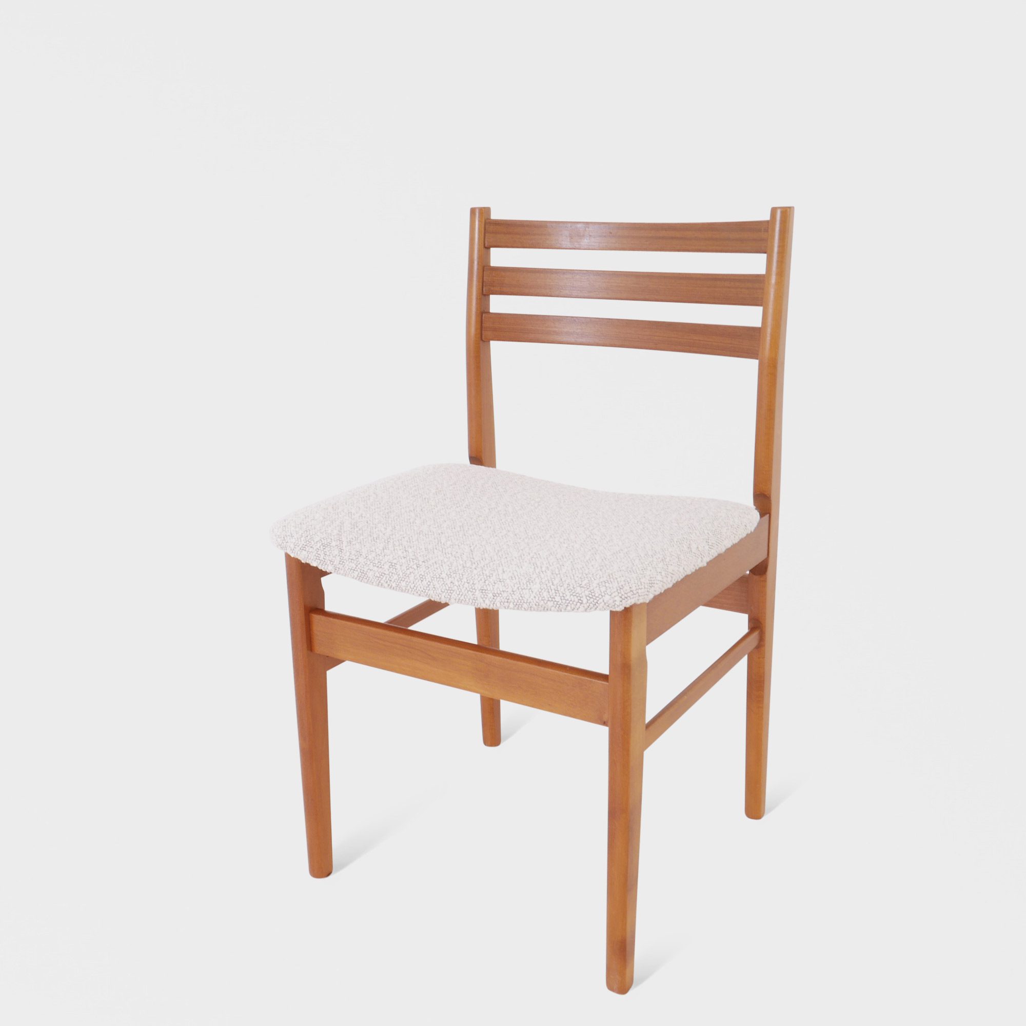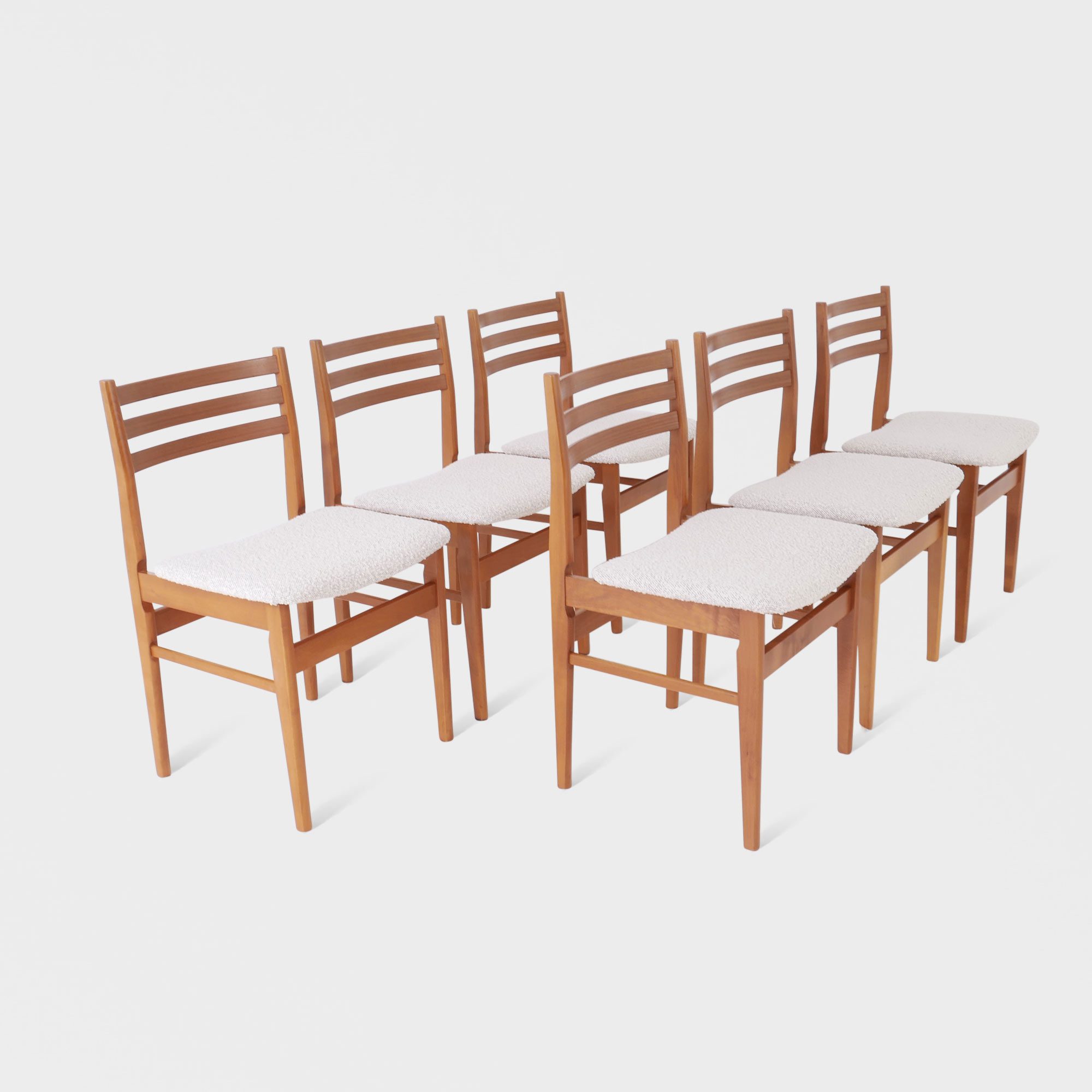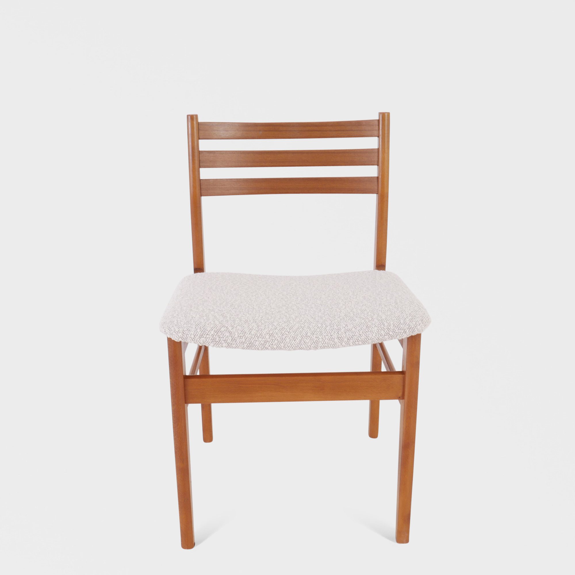 Sett med 6 spisestoler fra 1960-tallet. Nydelige detaljer. Setene er nyomtrukket i lys boucle. Klassisk skandinavisk stil av god kvalitet med behagelige finish, som fremhever den organiske formen på ryggstøttene i teak som gir stolen god komfort. I god vintage stand.