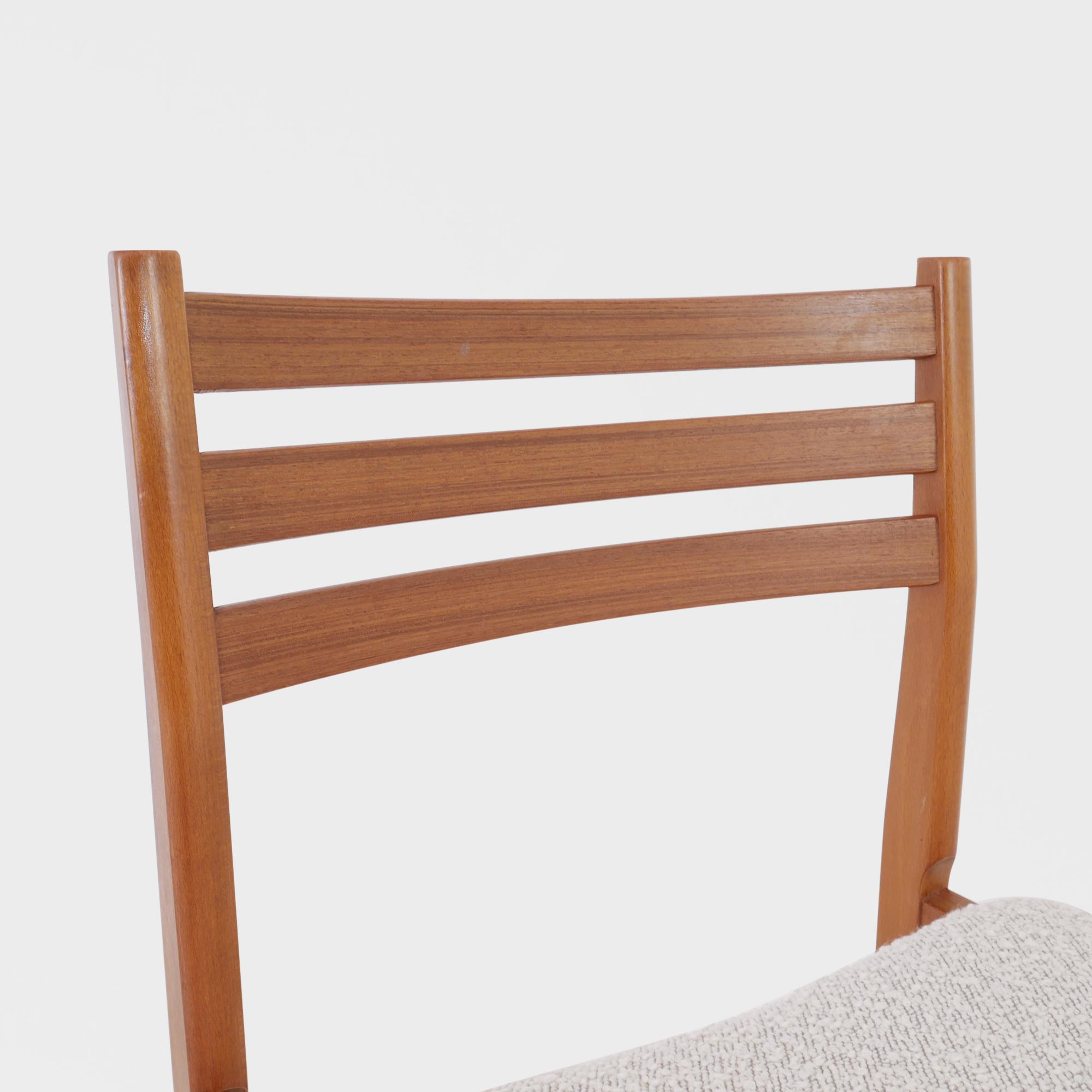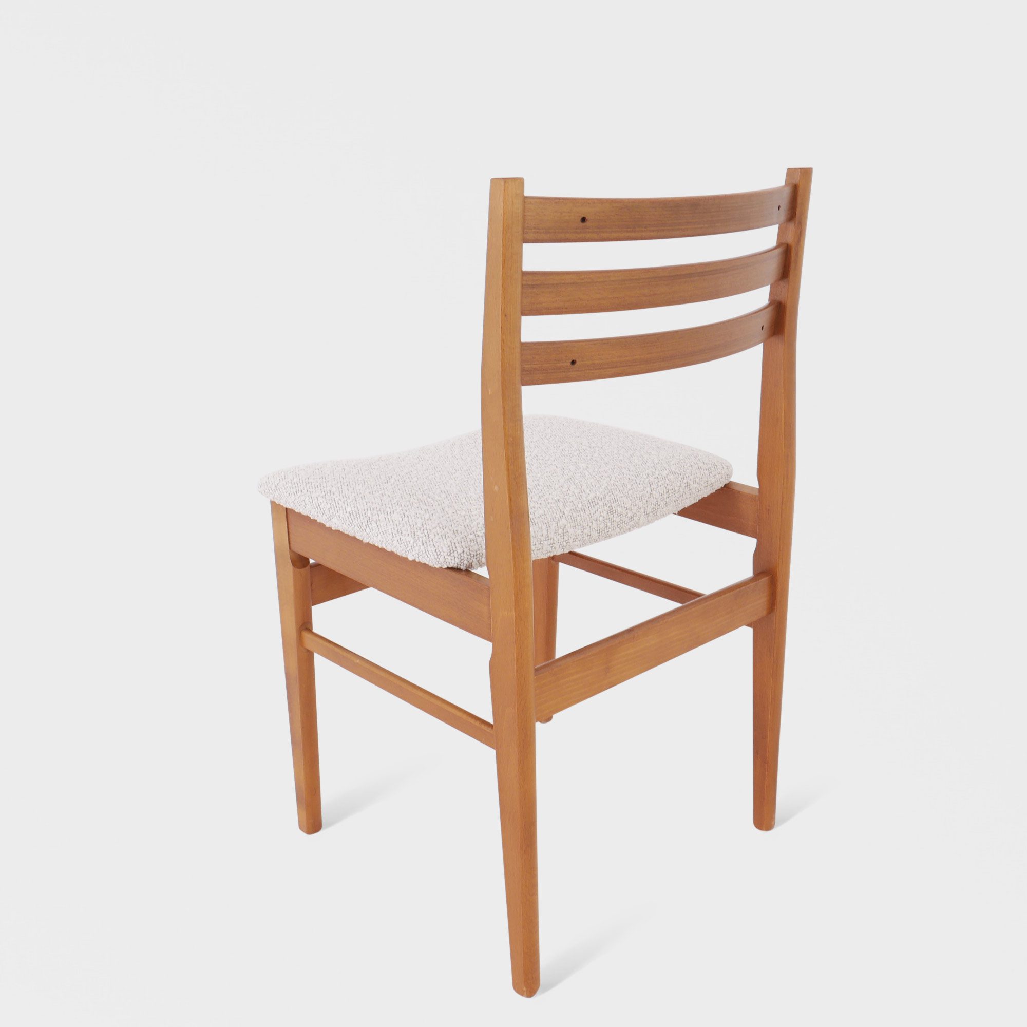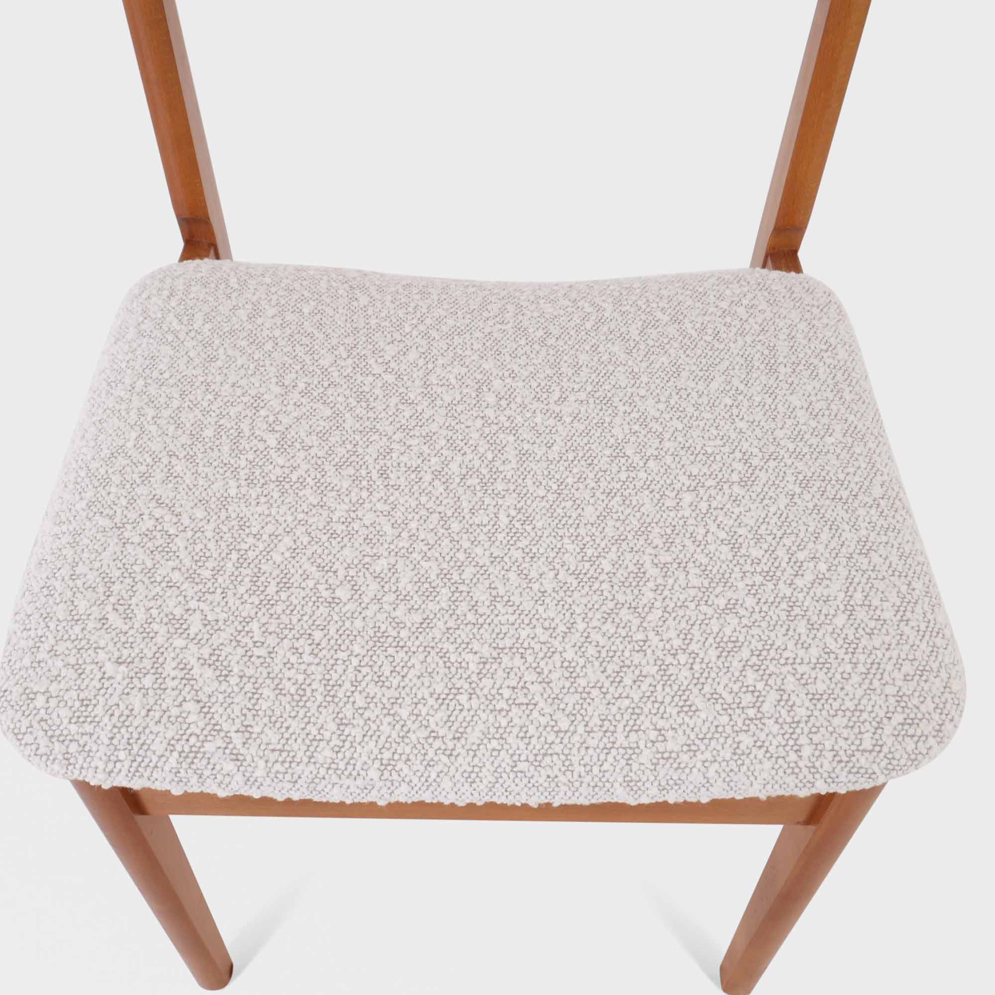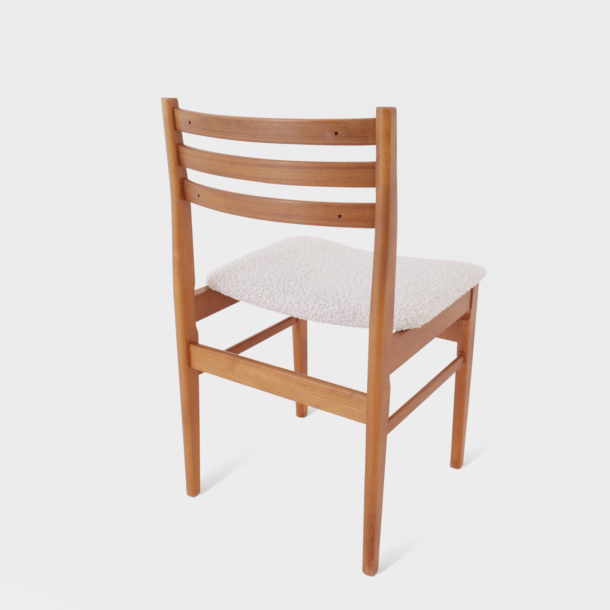 Sett med 6 spisestoler fra 1960-tallet. Nydelige detaljer. Setene er nyomtrukket i lys boucle. Klassisk skandinavisk stil av god kvalitet med behagelige finish, som fremhever den organiske formen på ryggstøttene i teak som gir stolen god komfort. I god vintage stand.