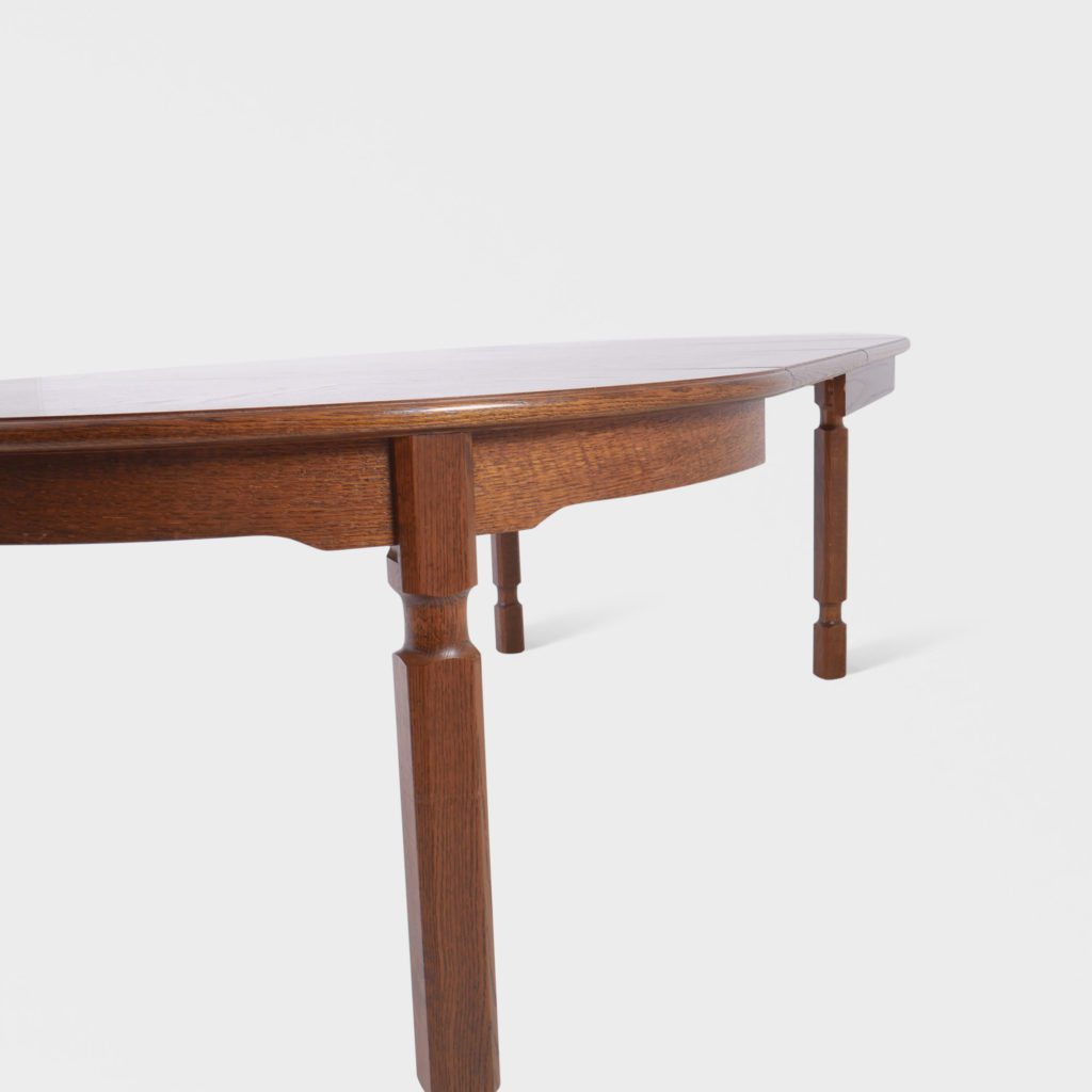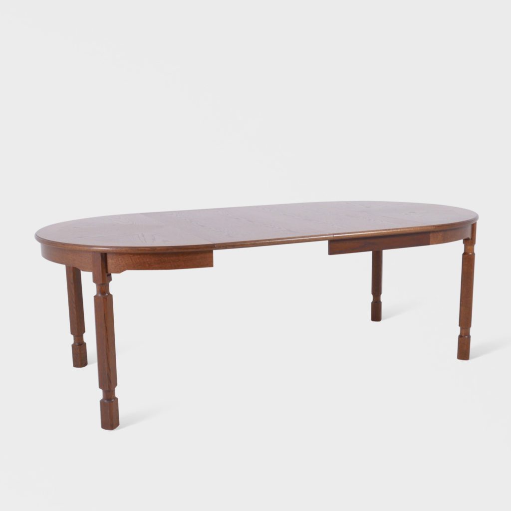 Rundt spisebord i eik med to plater. Fin organisk form. I god vintage stand. Designer: Ukjent Produsent: Ukjent Land: Norge År: 1970-tallet Tilstand: God vintage stand Mål: Ø:116cm/216cm (2×50cm) H:73cm Frakt: - Pris inkluderer frakt på strekningen Drammen - Oslo onsdager mellom 15-20 (til gateplan). - Vi sender i hele landet. Ta kontakt for gode priser på frakt. - Lageret er alltid åpent for besøk Tirsdag & Onsdag kl 14-17. Ring 926 22 989 ved ankomst. Disclaimer: Vintage møbler er et produkt av høy kvalitet som varer flere liv av en grunn. Noen har en rik historie, hvor enkelte produkter vil bære preg av dette. Studer derfor bildene godt før kjøp.