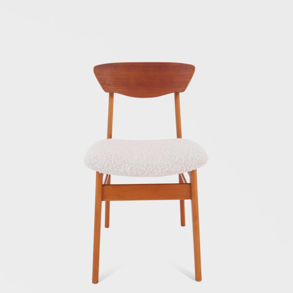 Sett med 3 spisestoler fra 1960-tallet. Nydelige detaljer. Setene er nyomtrukket i lys boucle. Klassisk skandinavisk stil av høy kvalitet med behagelige finish, som fremhever den organiske formen på ryggstøttene i teak som gir stolen god komfort. I god vintage stand. Selges samlet og oppgitt pris er for alle 3 stolene Land: Norge År: 1960-tallet Tilstand: God vintage stand Mål: H:78cm H.sete:45cm B:42cm D:46cm Frakt: - Pris inkluderer frakt på strekningen Drammen - Oslo onsdager mellom 15-20 (til gateplan). - Vi sender i hele landet. Ta kontakt for gode priser på frakt. - Lageret er alltid åpent for besøk Tirsdag & Onsdag kl 14-17. Ring 926 22 989 ved ankomst. Disclaimer: Vintage møbler er et produkt av høy kvalitet som varer flere liv av en grunn. Noen har en rik historie, hvor enkelte produkter vil bære preg av dette. Studer derfor bildene godt før kjøp.
