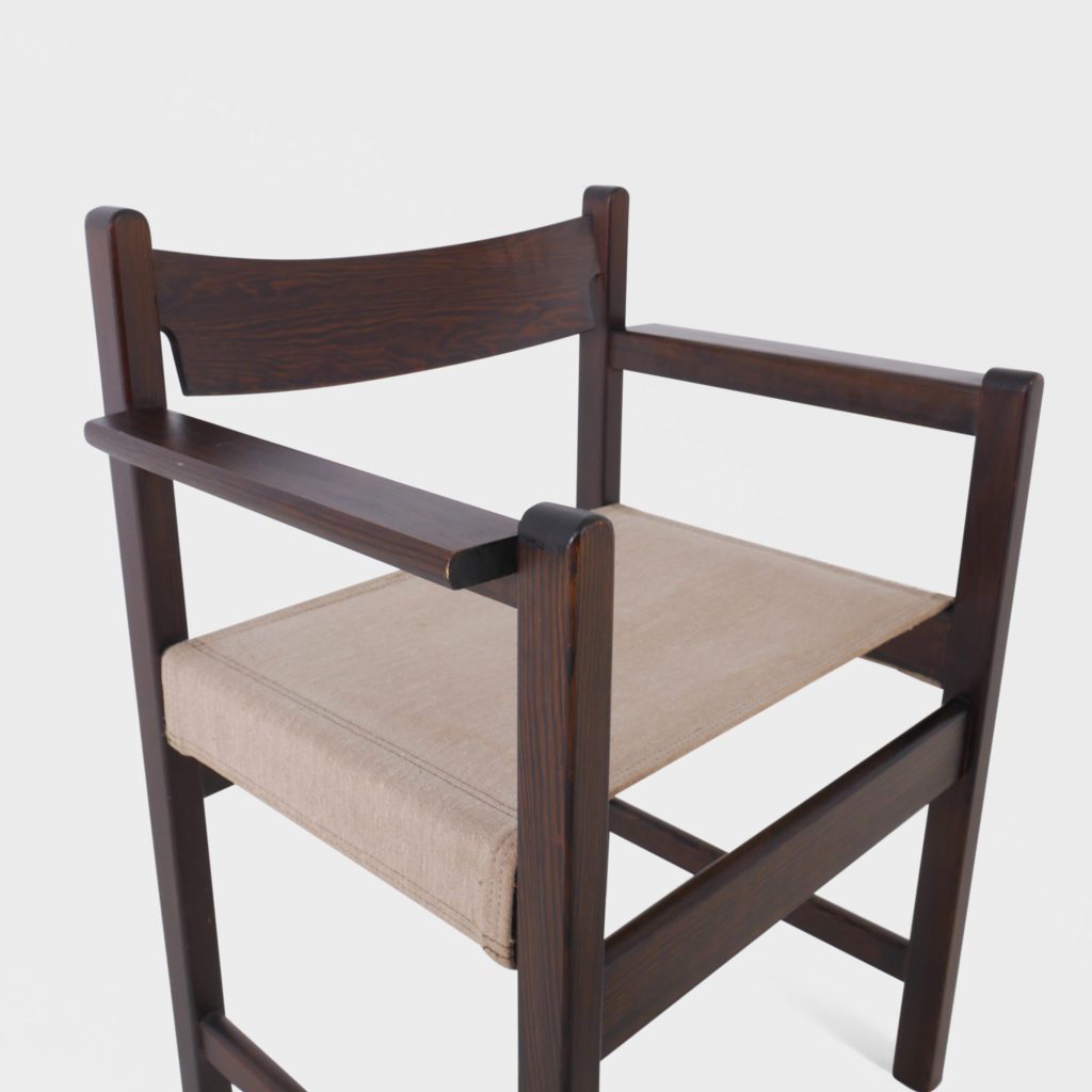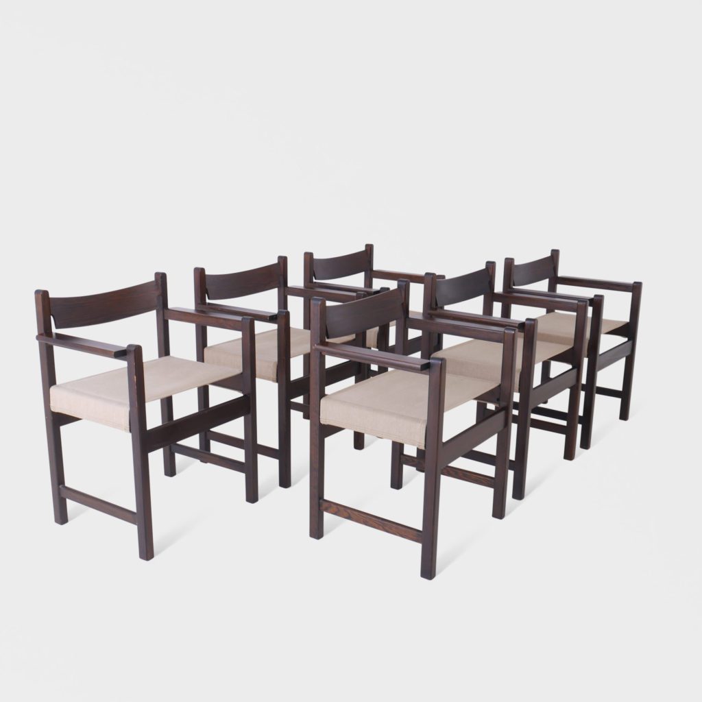 Norsk designklassiker fra Rastad og Relling. 6 stk spisestoler med seter av kanvas og ramme i mørkbeiset furu. naturlige bruksmerker for alderen. Med “Futurum-serien” gav Adolf Relling og hans medarbeidere Torbjørn Brekken, Rolf Gabrielsen og Bibben Løken i tegenekontoret en selvstendig formoppfatning av vanlige menneskers behov. Fra Adolf Rellings første lenestol i 1965 og fremover på 1970-tallet med stadig nye modeller og varianter over temaet blir “Futurum”-møblene et kjærkomment innslag i det norske bomiljø. I 1968 ble “Futurumserien” tildelt Den Norske Designpris.» Prisen er samlet for alle stolene Designer: Rastad og Relling Produsent: Sørlie Møbler Land: Norge År: 1960-tallet Tilstand: God vintage stand Mål: H: 78cm H.sitte: 45cm B: 59cm D: 48cm. Frakt: - Pris inkluderer frakt på strekningen Drammen - Oslo onsdager mellom 15-20 (til gateplan). - Vi sender i hele landet. Ta kontakt for gode priser på frakt. - Lageret er alltid åpent for besøk Tirsdag & Onsdag kl 14-17. Ring 926 22 989 ved ankomst. Disclaimer: Vintage møbler er et produkt av høy kvalitet som varer flere liv av en grunn. Noen har en rik historie, hvor enkelte produkter vil bære preg av dette. Studer derfor bildene godt før kjøp.
